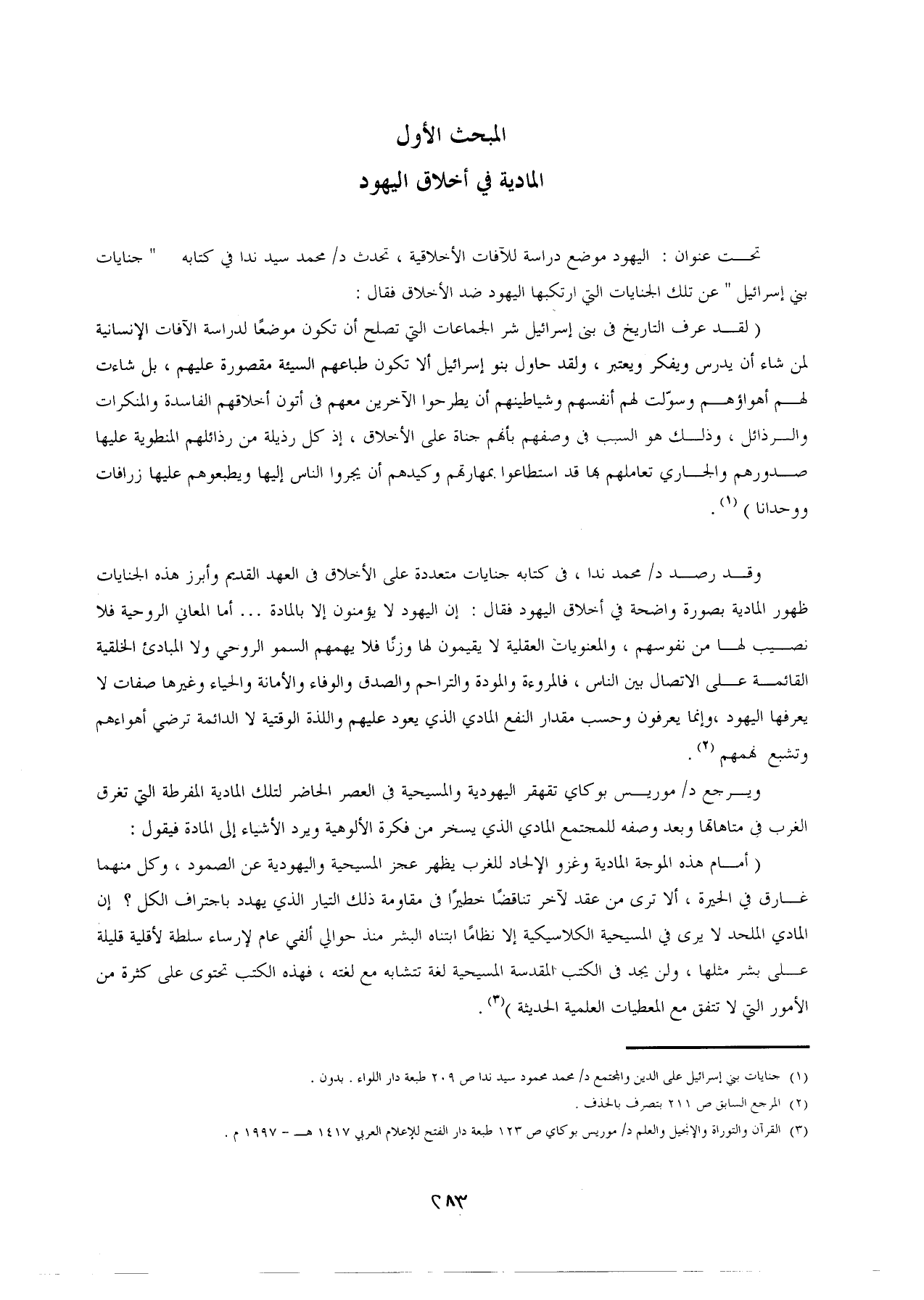 وقد رصد د/ محمَّد ندا، في كتابه جنايات متعددة على الأخلاق في العهد القديم وأبرز هذه الجنايات ظهور المادية بصورة واضحة في أخلاق اليهود فقال: إن اليهود لا يؤمنون إلا بالمادة ... أما المعاني الروحية فلا نصيب لها من نفوسهم، والمعنويات العقلية لا يقيمون لها وزنًا فلا يهمهم السمو الروحى ولا المبادئ الخلقية القائمة على الاتصال بين الناس، فالمروءة والمودة والتراحم والصدق والوفاء والأمانة والحياء وغيرها صفات لا يعرفها اليهود، وإنما يعرفون وحسب مقدار النفع المادي الذي يعود عليهم واللذة الوقتية لا الدائمة ترضى أهواءهم وتشبع نهمهم (¬2).
