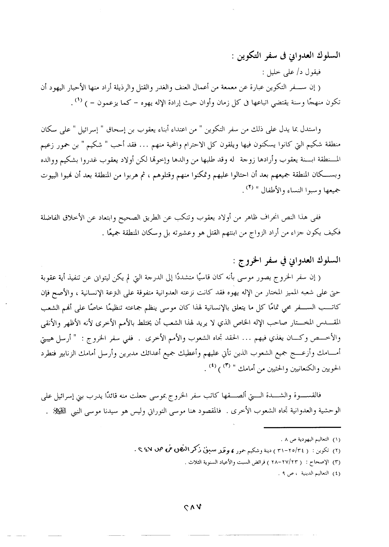 (إن سفر التكوين عبارة عن معمعة من أعمال العنف والغدر والقتل والرذيلة أراد منها الأحبار اليهود أن تكون منهجًا وسنة يقتضي اتباعها في كل زمان وأوان حيث إرادة الإله يهوه- كما يزعمون-) (¬1).