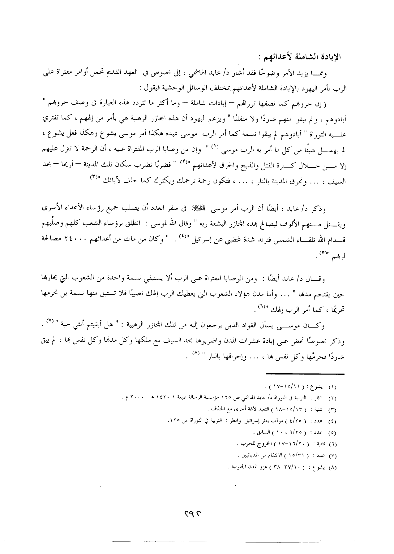 ومما يزيد الأمر وضوحًا فقد أشار د/ عابد الهاشمى، إلى نصوص في العهد القديم تحمل أوامر مفتراة على الرب تأمر اليهود بالإبادة الشاملة لأعدائهم. بمختلف الوسائل الوحشية فيقول: