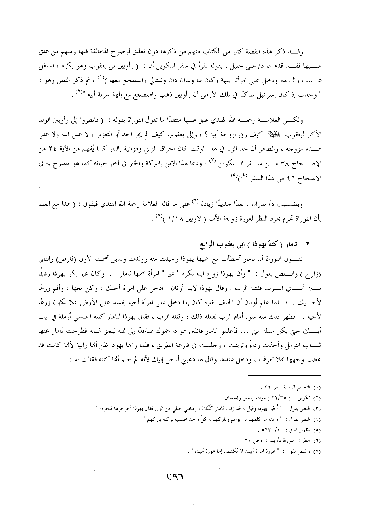 ولكن العلامة رحمة الله الهندي علق عليها منتقدًا ما تقول التوراة بقوله: (فانظروا إلى رأوبين الولد الأكبر ليعقوب -عليه السلام- كيف زنى بزوجة أبيه؟، وإلى يعقوب كيف لم يجر الحد أو التعزير، لا على ابنه ولا على هذه الزوجة، والظاهر أن حدّ الزنا في هذا الوقت كان إحراق الزاني والزانية بالنار كما يُفهم من الآية 24 من الإصحاح 38 من سفر التكوين (¬3)، ودعا لهذا الابن بالبركة والخير في آخر حياته كما هو مصرح به في الإصحاح 49 من هذا السفر (¬4)) (¬5).