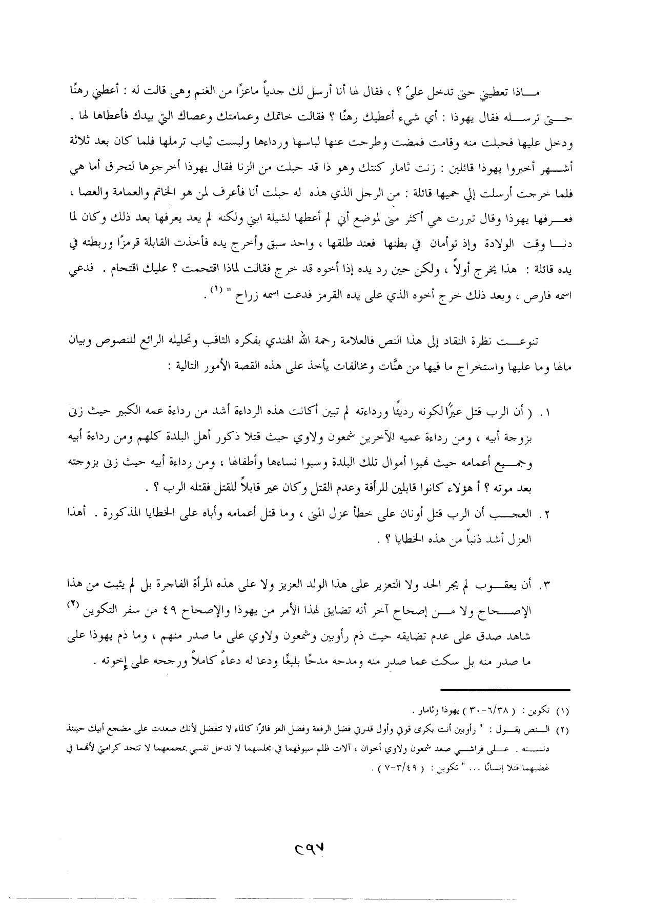 1 - (أن الرب قتل عيرًا لكونه رديئًا ورداءته لم تبيّن أكانت هذه الرداءة أشد من رداءة عمه الكبير حيث زنى بزوجة أبيه، ومن رداءة عليه الآخرين شمعون ولاوي حيث قتلا ذكور أهل البلدة كلهم ومن رداءة أبيه وجميع أعمامه حيث نهبوا أموال تلك البلدة وسبوا نساءها وأطفالها، ومن رداءة أبيه حيث زنى بزوجته بعد موته؟ أهؤلاء كانوا قابلين للرأفة وعدم القتل وكان عير قابلًا للقتل فقتله الرب؟.