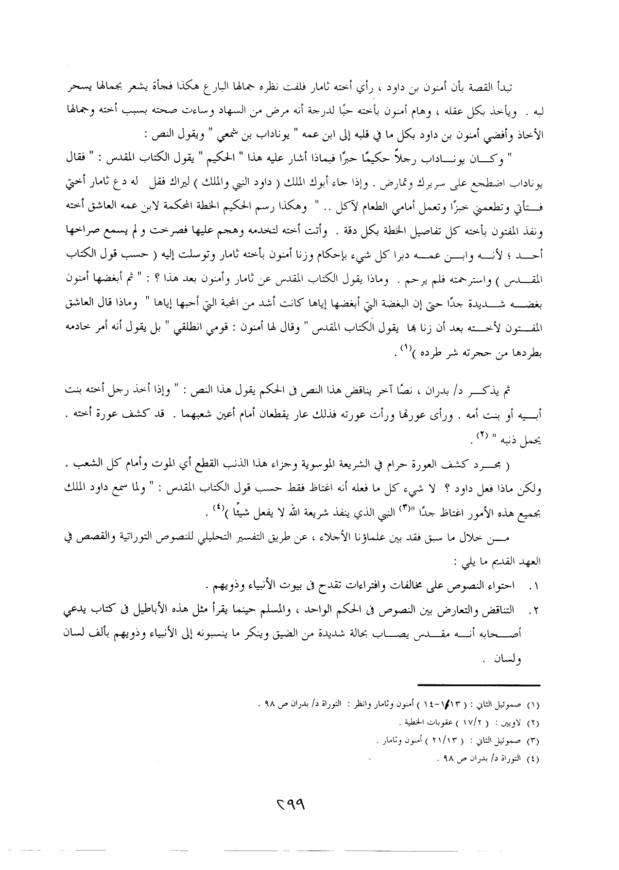 (مجرد كشف العورة حرام في الشريعة الموسوية وجزاء هذا الذنب القطع أي الموت وأمام كل الشعب. ولكن ماذا فعل داود؟ لا شىء كل ما فعله أنه اغتاظ فقط حسب قول الكتاب المقدس: "ولما سمع داود الملك بجميع هذه الأمور اغتاظ جدًا" (¬3) النبي الذي ينفذ شريعة الله لا يفعل شيئًا) (¬4).