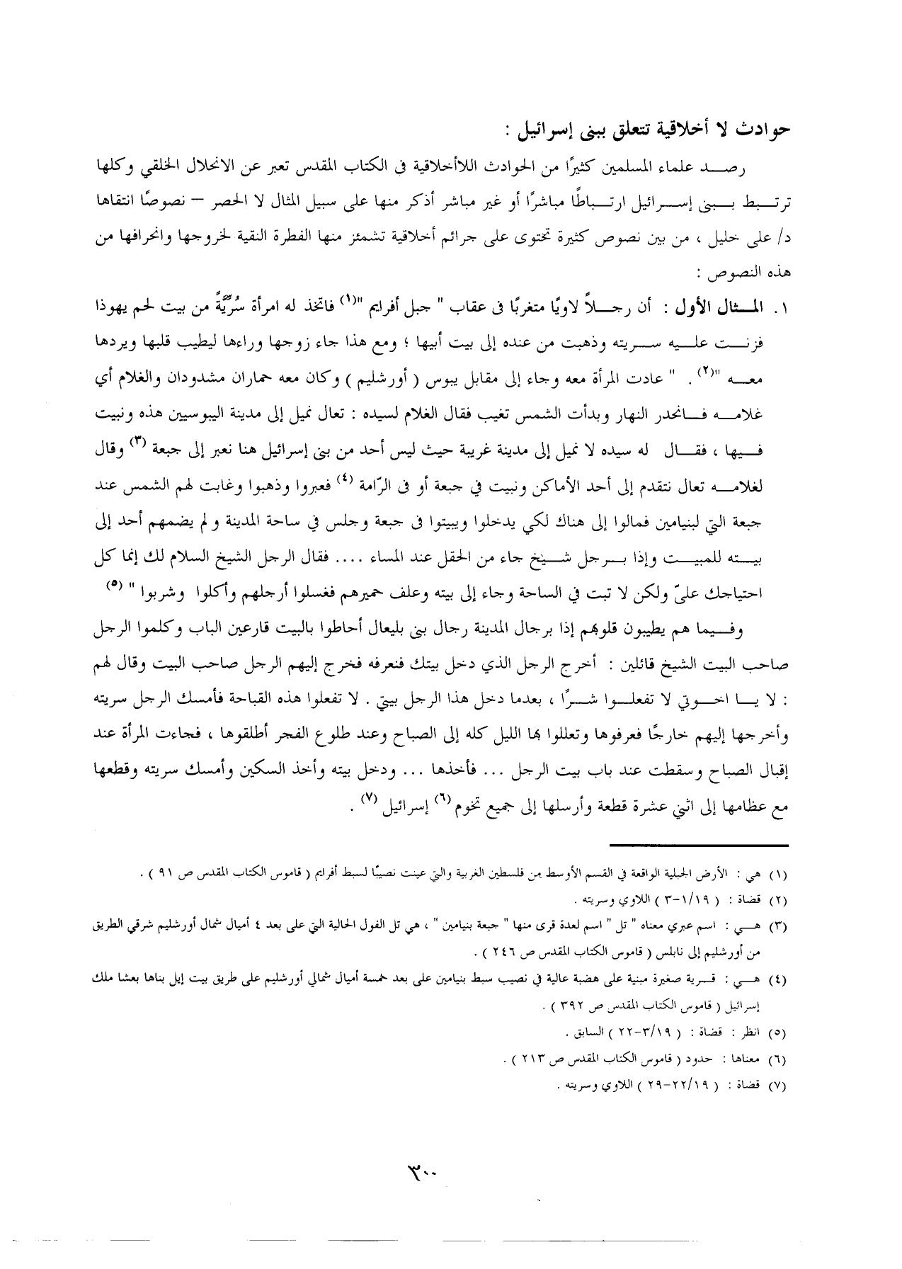 1 - المثال الأوّل: أن رجلًا لاويًا متغربًا في عقاب "جبل أفرايم" (¬1) فاتخذ له امرأة سُريةً من بيت لحم يهوذا فزنت عليه سريته وذهبت من عنده إلى بيت أبيها؛ ومع هذا جاء زوجها وراءها ليطيب قلبها ويردها معه" (¬2). "عادت المرأة معه وجاء إلى مقابل يبوس (أورشليم) وكان معه حماران مشدودان والغلام أي غلامه فانحدر النهار وبدأت الشمس تغيب فقال الغلام لسيده: تعال نميل إلى مدينة اليبوسيين هذه ونبيت فيها، فقال له سيده لا نميل إلى مدينة غريبة حيث ليس أحد من بنى إسرائيل هنا نعبر إلى جبعة (¬3) وقال لغلامه تعال نتقدم إلى أحد الأماكن ونبيت في جبعة أو في الرّامة (¬4) فعبروا وذهبوا وغابت لهم الشمس عند جبعة التي لبنيامين فمالوا إلى هناك لكي يدخلوا ويبيتوا في جبعة وجلس في ساحة الدينة ولم يضمهم أحد إلى بيته للمبيت وإذا برجل شيح جاء من الحقل عند المساء .... فقال الرجل الشيخ السلام لك إنما كل احتيِاجك علىّ ولكن لا تبت في الساحة وجاء إلى بيته وعلف حميرهم فغسلوا أرجلهم وأكلوا وشربوا" (¬5) وفيما هم يطيبون قلوبهم إذا برجال المدينة رجال بنى بليعال أحاطوا بالبيت قارعين الباب وكلموا الرجل صاحب البيت الشيخ قائلين: أخرج الرجل الذي دخل بيتك فنعرفه فخرج إليهم الرجل صاحب البيت وقال لهم: لا يا اخوتي لا تفعلوا شرًا، بعد ما دخل هذا الرجل بيتي. لا تفعلوا هذه القباحة فأمسك الرجل سريته وأخرجها إليهم خارجًا فعرفوها وتعللوا بها الليل كله إلى الصباح وعند طلوع الفجر أطلقوها، فجاءت المرأة عند إقبال الصباح وسقطت عند باب بيت الرجل ... فأخذها ... ودخل بيته وأخذ السكين وأمسك سريته وقطعها مع عظامها إلى اثني عشرة قطعة وأرسلها إلى جميع تخوم (¬6) إسرائيل (¬7).