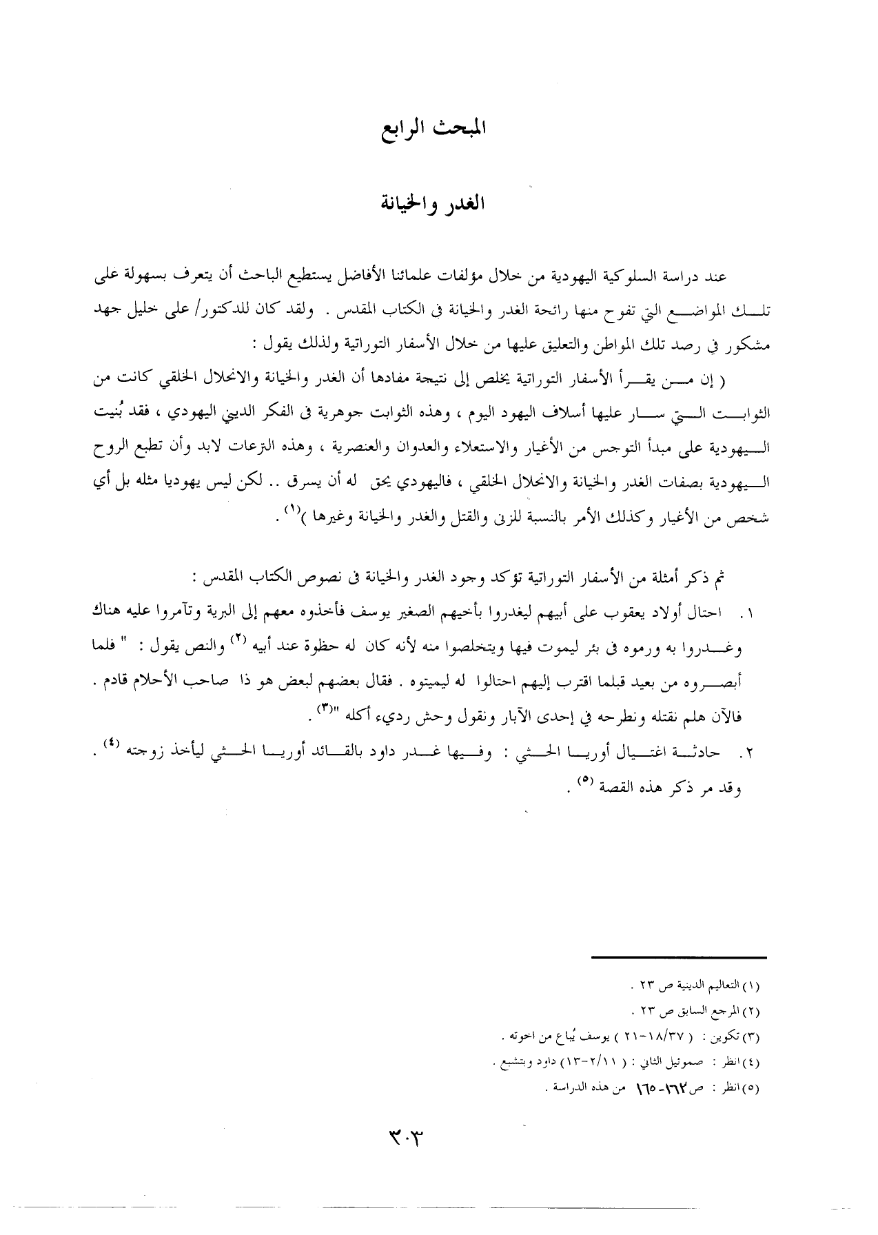 ثم ذكر أمثلة من الأسفار التوراتية تؤكد وجود الغدر والخيانة في نصوص الكتاب المقدس: