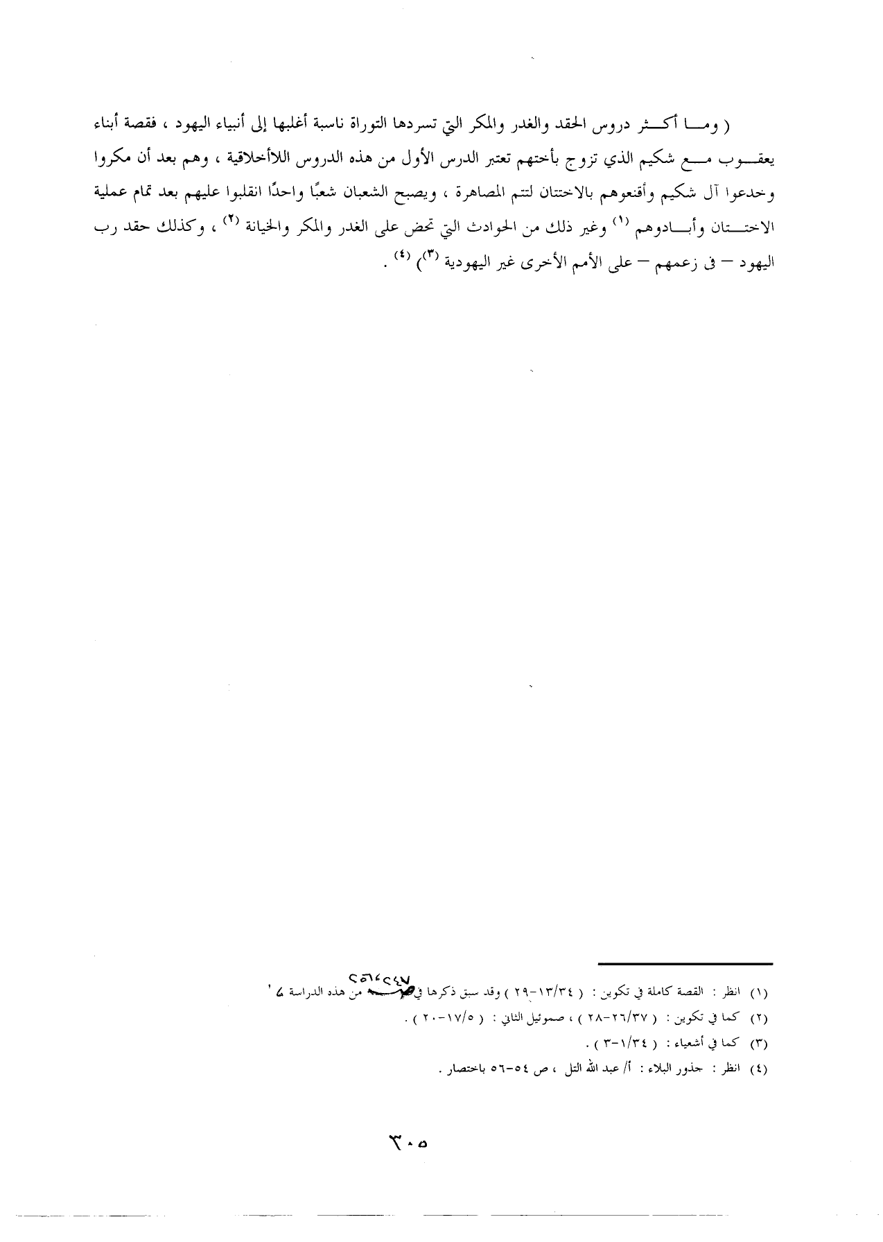 (وما أكثر دروس الحقد والغدر والمكر التي تسردها التوراة ناسبة أغلبها إلى أنبياء اليهود، فقصة أبناء يعقوب مع شكيم الذي تزوج بأختهم تعتبر الدرس الأوّل من هذه الدروس اللا أخلاقية، وهم بعد أن مكروا وخدعوا آل شكيم وأقنعوهم بالاختتان لتتم المصاهرة، ويصبح الشعبان شعبًا واحدًا انقلبوا عليهم بعد تمام عملية الاختتان وأبادوهم (¬1) وغير ذلك من الحوادث التي تحض على الغدر والمكر والخيانة (¬2)، وكذلك حقد رب اليهود -في زعمهم- على الأمم الأخرى غير اليهودية (¬3)) (¬4).