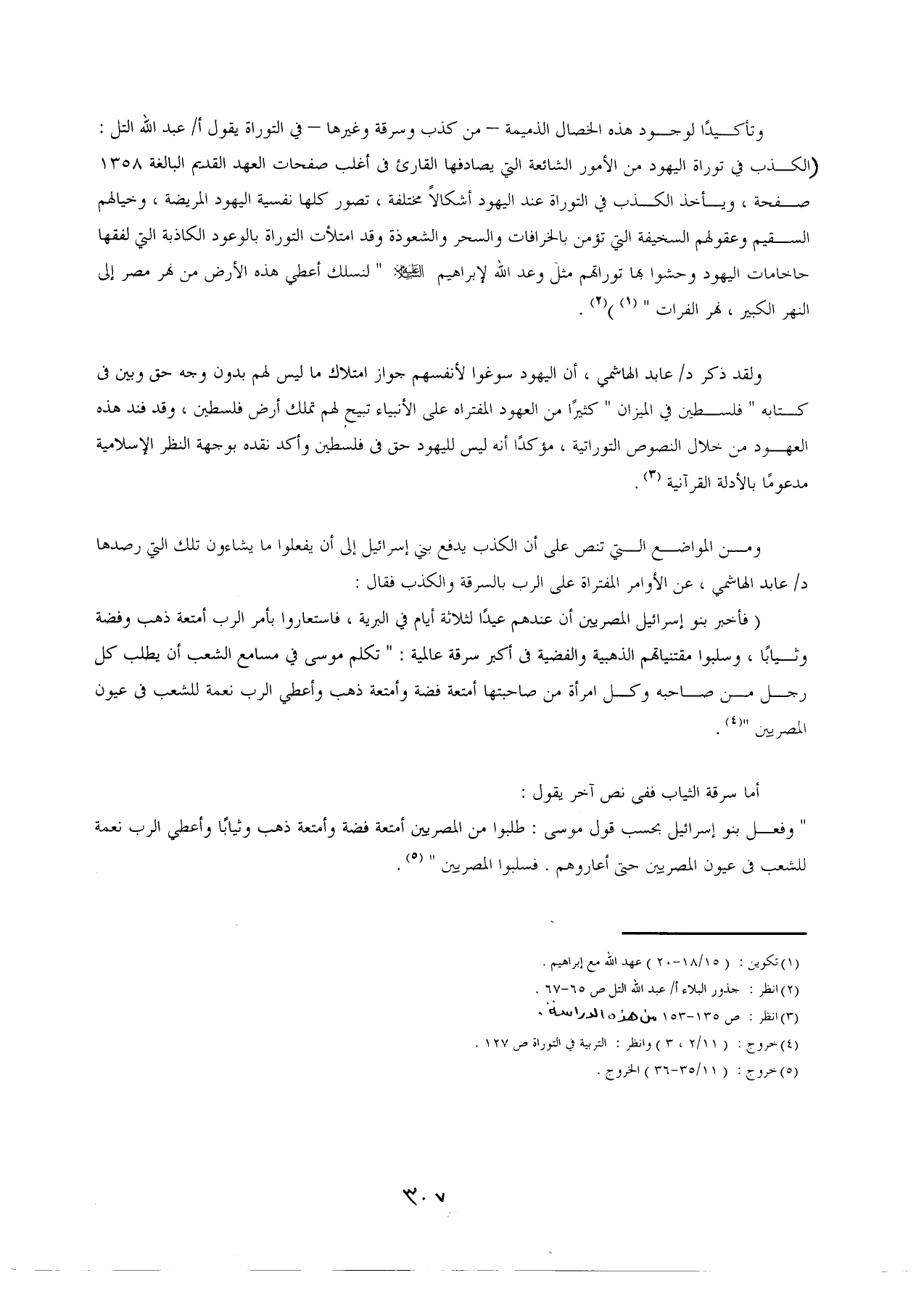 وتأكيدًا لوجود هذه الخصال الذميمة- من كذب وسرقة وغيرها- في التوراة يقول أ/ عبد الله التل: (الكذب في توراة اليهود من الأمور الشائعة التي يصادفها القاريء في أغلب صفحات العهد القديم البالغة 1358 صفحة، ويأخذ الكذب في التوراة عند اليهود أشكالًا مختلفة، تصور كلها نفسية اليهود المريضة، وخيالهم السقيم وعقولهم السخيفة التي تؤمن بالخرافات والسحر والشعوذة وقد امتلأت التوراة بالوعود الكاذبة التي لفقها حاخامات اليهود وحشوا بها توراتهم مثل وعد الله لإبراهيم -عليه السلام- لنسلك أعطي هذه الأرض من نهر مصر إلى النهر الكبير، نهر الفرات" (¬1)) (¬2).