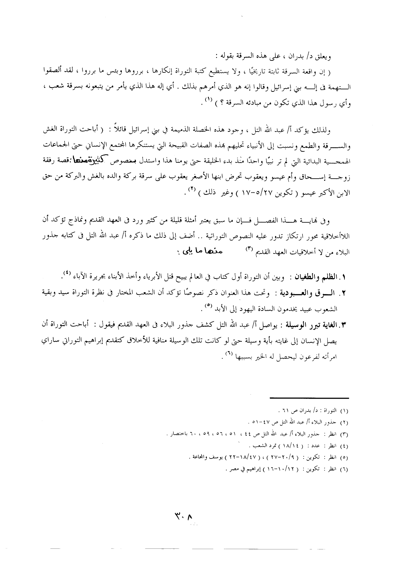 3 - الغاية تبرر الوسيلة: يواصل أ/ عبد الله التل كشف جذور البلاء في العهد القديم فيقولى: أباحت التوراة أن يصل الإنسان إلى غايته بأية وسيلة حتى لو كانت تلك الوسيلة منافية للأخلاق كتقديم إبراهيم التوراتي ساراي امرأته لفرعون ليحصل له الخير بسببها (¬6).