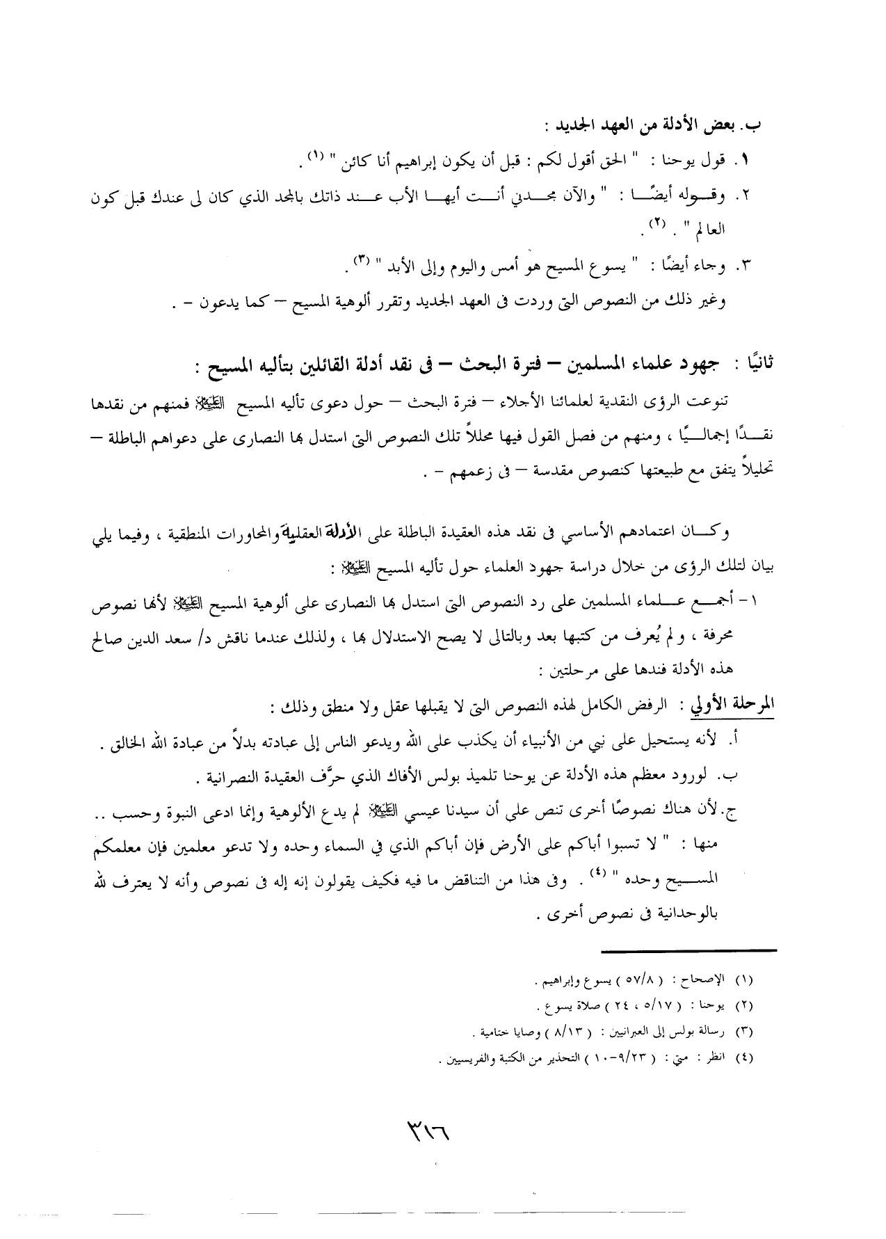 1 - أجمع علماء المسلمين على رد النصوص إلى استدل بها النصارى على ألوهية المسيح -عليه السلام- لأنها نصوص محرفة، ولم يُعرف من كتبها بعد وبالتالى لا يصح الاستدلال بها، ولذلك عندما ناقش د/ سعد الدين صالح هذه الأدلة فندها على مرحلتين: