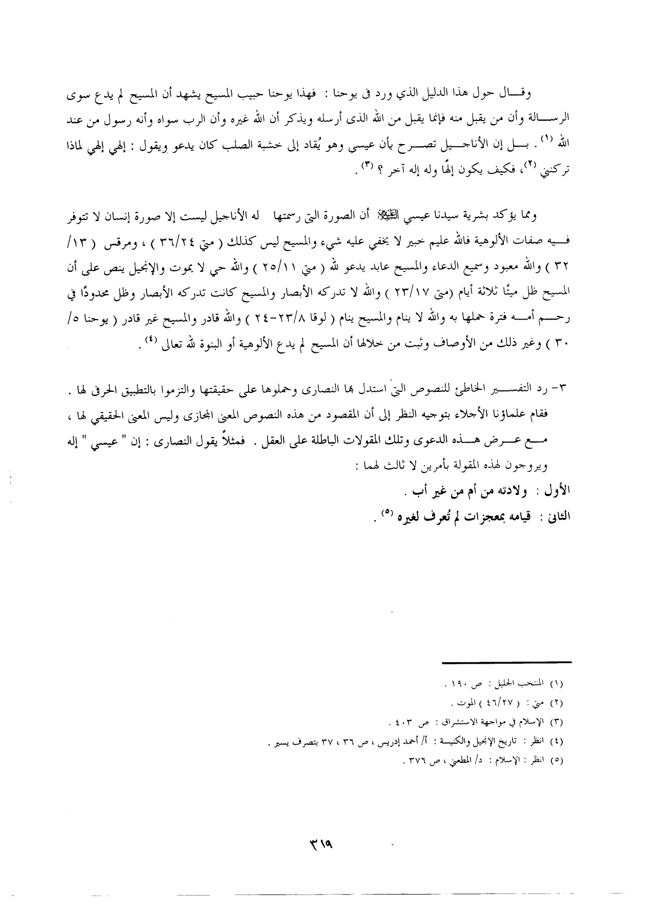وقال حول هذا الدليل الذي ورد في يوحنا: فهذا يوحنا حبيب المسيح يشهد أن المسيح لم يدع سوى الرسالة وأن من يقبل منه فإنما يقبل من الله الذي أرسله ويذكر أن الله غيره وأن الرب سواه وأنه رسول من عند الله (¬1). بل إن الأناجيل تصرح يأن عيسي وهو يُقاد إلى خشبة الصلب كان يدعو ويقول: إلهى إلهى لماذا تركنني (¬2)، فكيف يكون إلهًا وله إله آخر؟ (¬3).