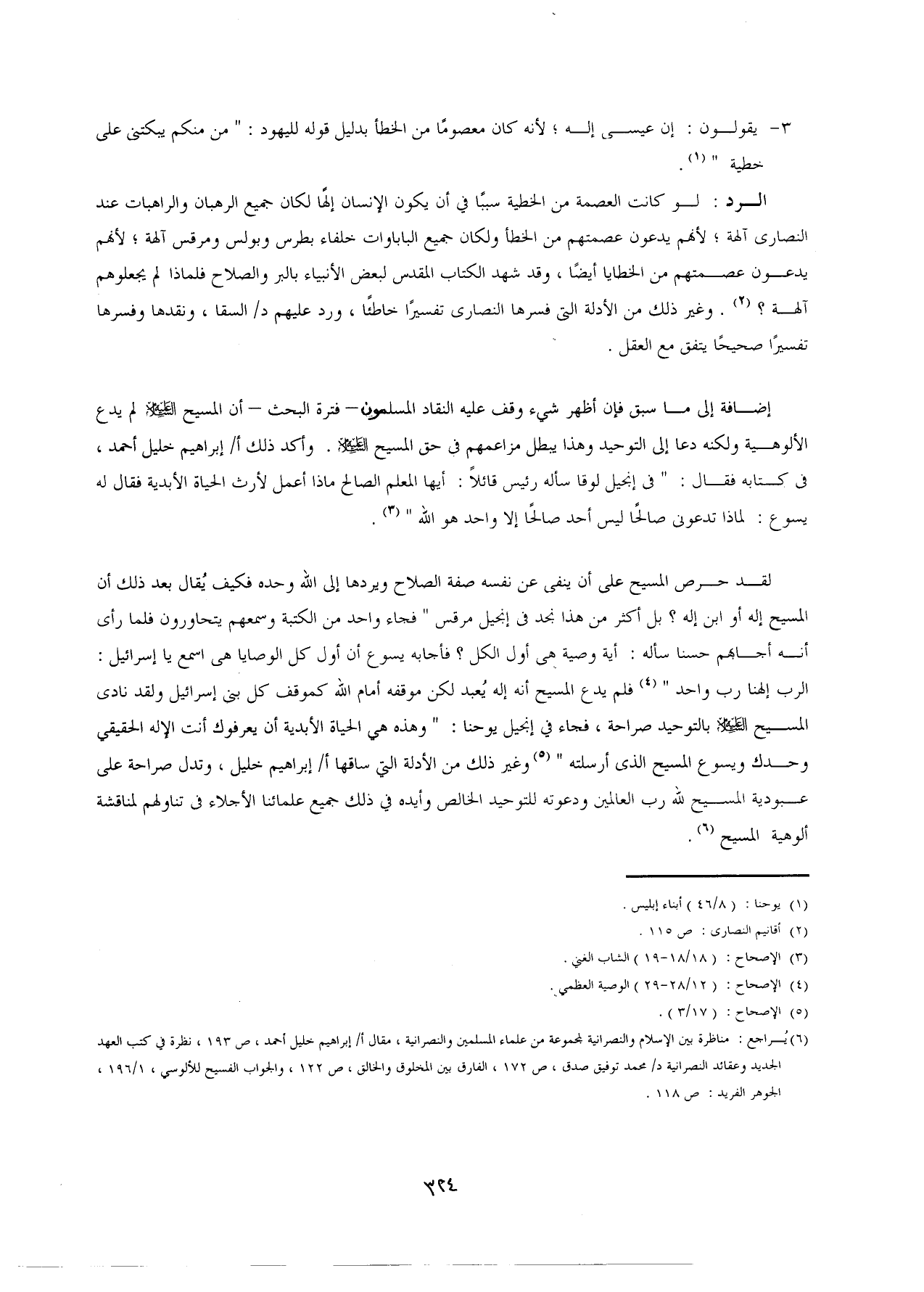 الرد: لو كانت العصمة من الخطية سببًا في أن يكون الإنسان إلهًا لكان جميع الرهبان والراهبات عند النصارى آلهة؛ لأنهم يدعون عصمتهم من الخطأ ولكان جميع الباباوات خلفاء بطرس وبولس ومرقس آلهة؛ لأنهم يدعون عصمتهم من الخطايا أيضًا، وقد شهد الكتاب المقدس لبعض الأنبياء بالبر والصلاح فلماذا لم يجعلوهم آلهة؟ (¬2). وغير ذلك من الأدلة التى فسرها النصارى تفسيرًا خاطئًا، ورد عليهم د/ السقا، ونقدها وفسرها تفسيرًا صحيحًا يتفق مع العقل.