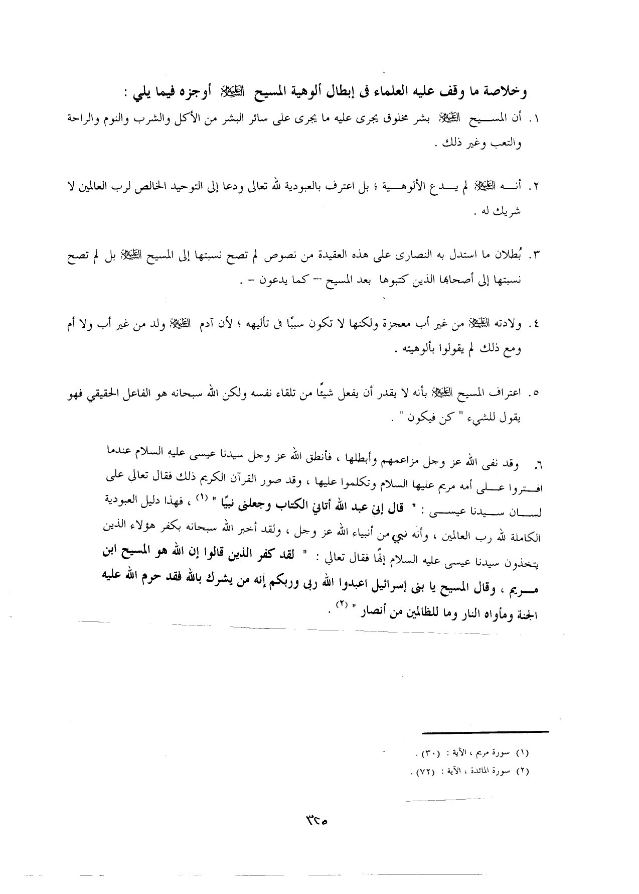 وخلاصة ما وقف عليه العلماء في إبطال ألوهية المسيح -عليه السلام- أوجزه فيما يلي: