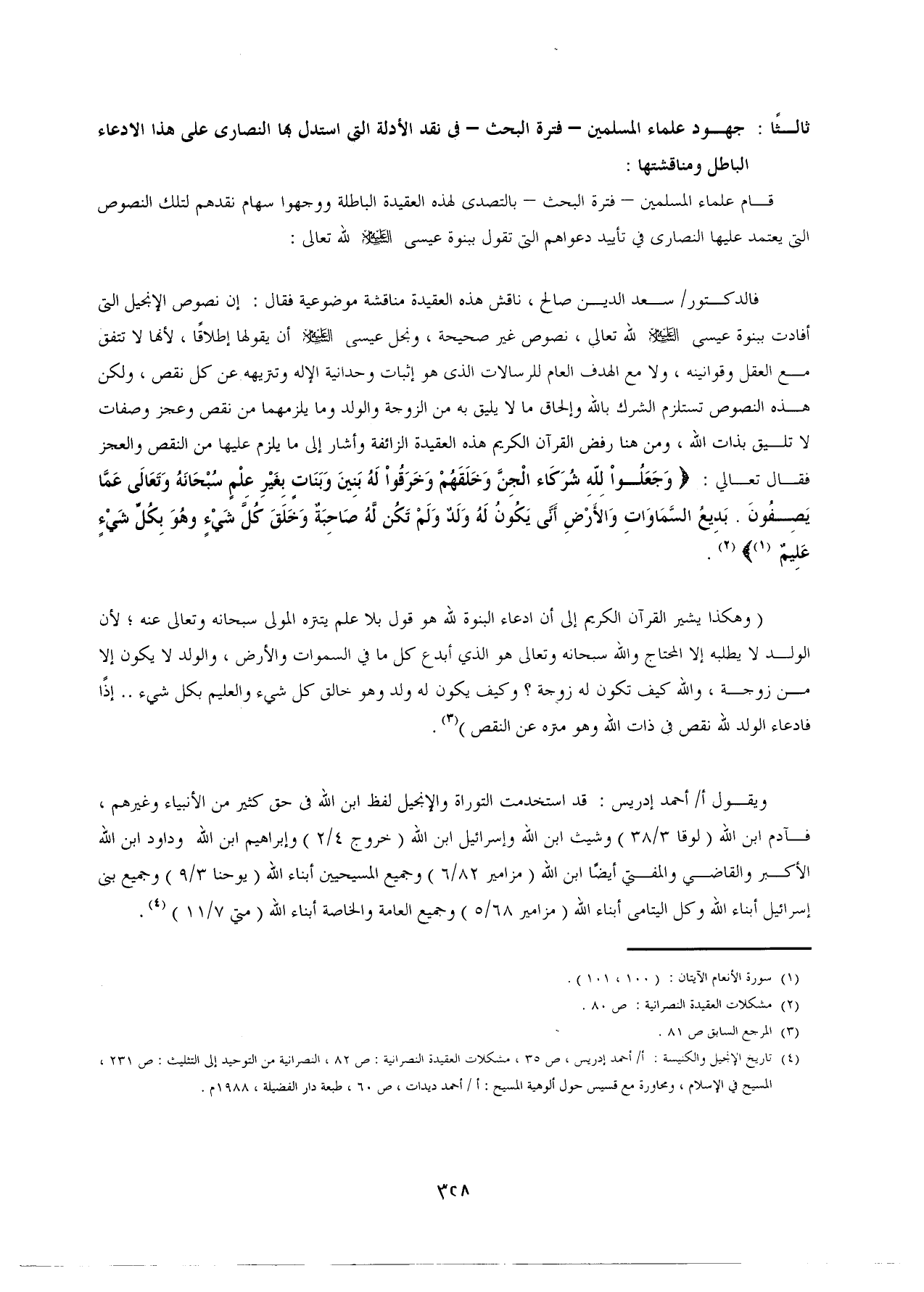 ثالثًا: جهود علماء المسلمين -فترة البحث- في نقد الأدلة التي استدل بها النصارى على هذا الادعاء الباطل ومناقشتها: