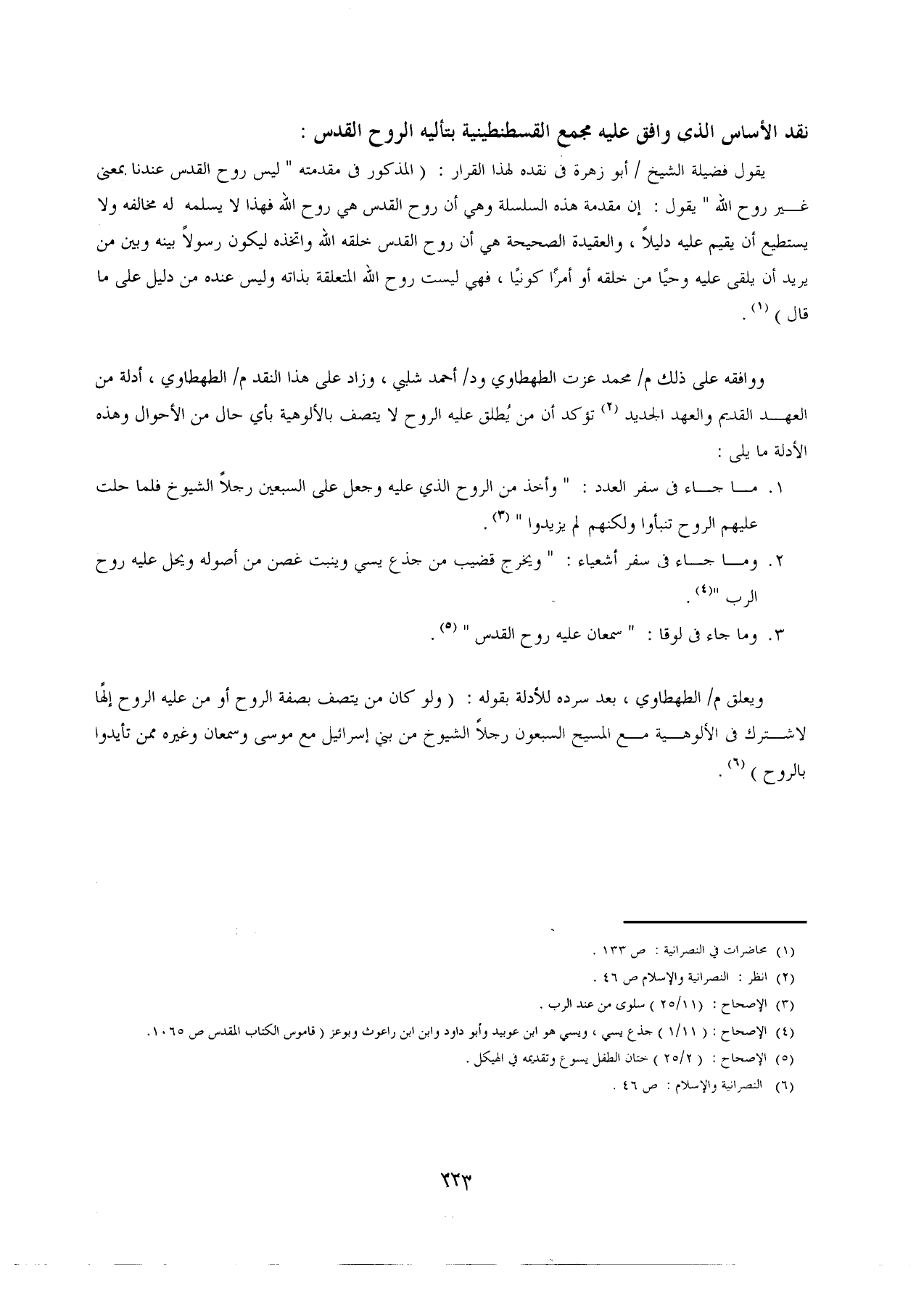 ووافقه على ذلك م / محمَّد عزت الطهطاوي ود/ أحمد شلبي، وزاد على هذا النقد م / الطهطاوي، أدلة من العهد القديم والعهد الجديد (¬2) تؤكد أن من يطلق عليه الروح لا يتصف بالألوهية بأي حال من الأحوال وهذه الأدلة ما يلي: