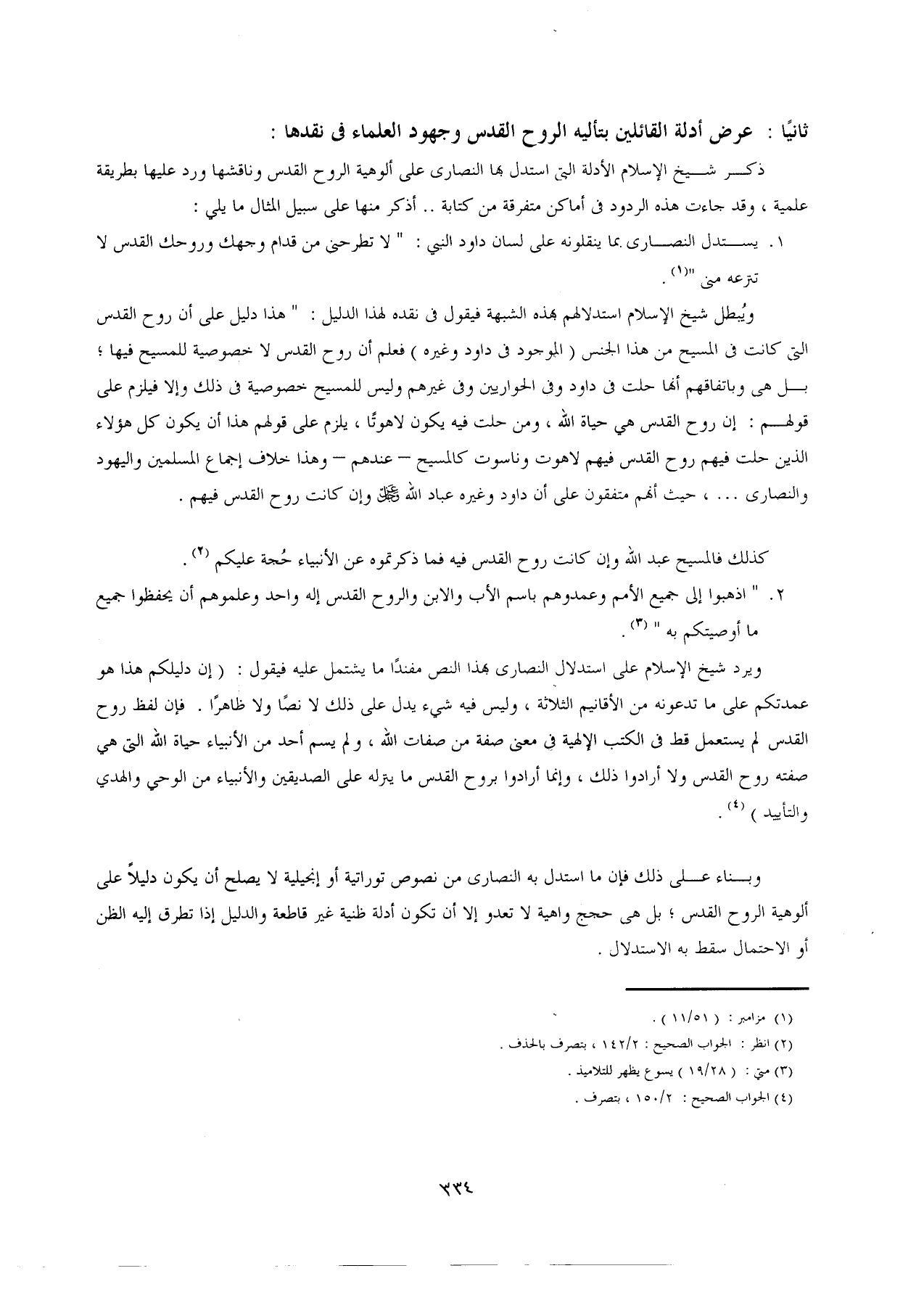 ويرد شيخ الإِسلام على استدلال النصارى بهذا النص مفندًا ما يشتمل عليه فيقول: (إن دليلكم هذا هو عمدتكم على ما تدعونه من الأقانيم الثلاثة، وليس فيه شىء يدلّ على ذلك لا نصًا ولا ظاهرًا. فإن لفظ روح القدس لم يستعمل قط في الكتب الإلهية في معنى صفة من صفات الله، ولم يسم أحد من الأنبياء حياة الله التى هى صفته روح القدس ولا أرادوا ذلك، وإنما أرادوا بروح القدس ما ينزله على الصديقين والأنبياء من الوحى والهدي والتأييد) (¬4).