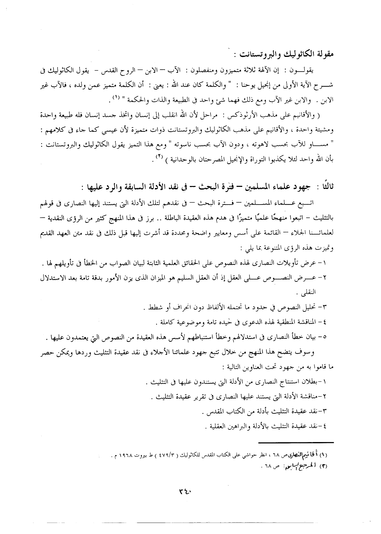 وسوف يتضح هذا المنهج من خلال تتبع جهود علمائنا الأجلاء في نقد عقيدة التثليث وردها ويمكن حصر ما قاموا به من جهود تحت العناوين التالية: