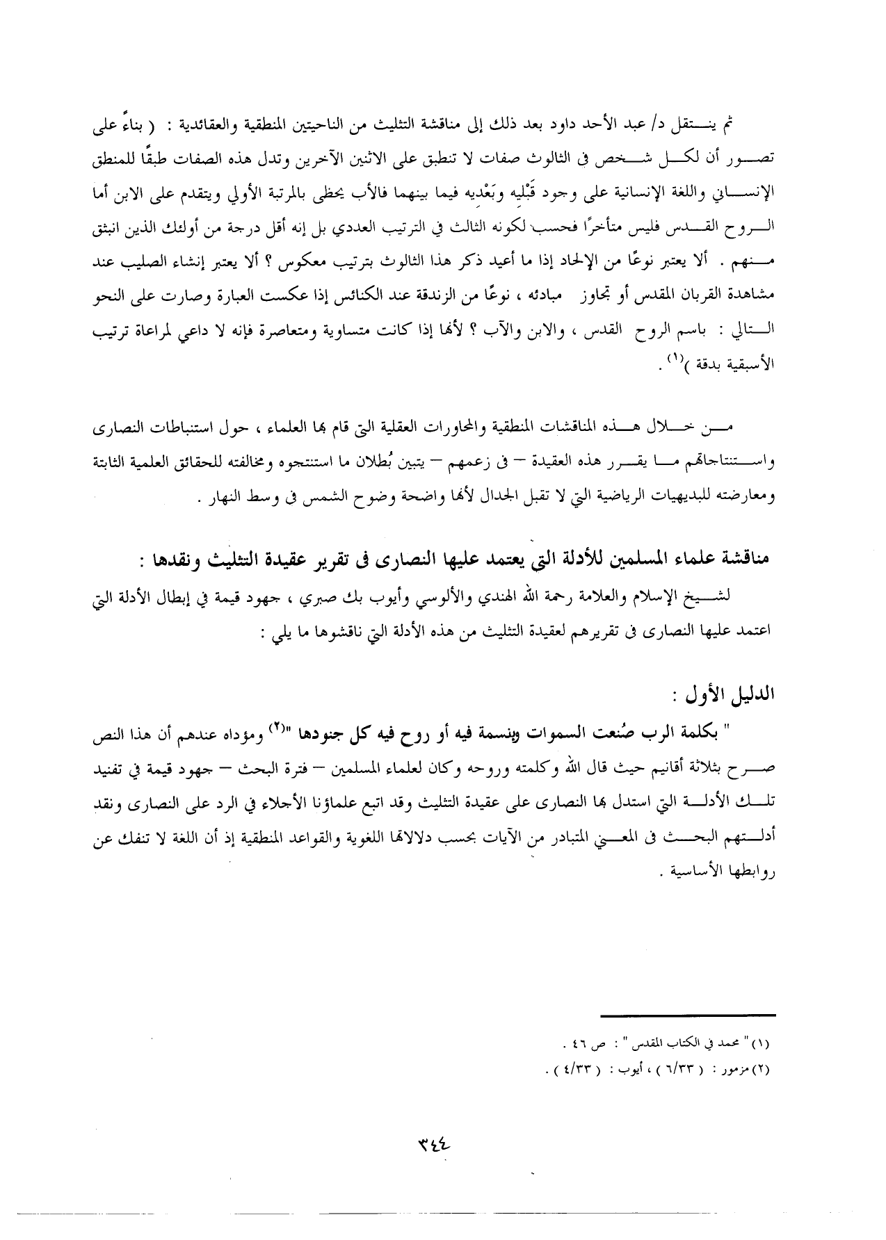 " بكلمة الرب صُنعت السموات وبنسمة فيه أو روح فيه كل جنودها" (¬2) ومؤداه عندهم أن هذا النص صرح بثلاثة أقانيم حيث قال الله وكلمته وروحه وكان لعلماء المسلمين -فترة البحث- جهود قيمة في تفنيد تلك الأدلة التي استدل بها النصارى على عقيدة التثليث وقد اتبع علماؤنا الأجلاء في الرد على النصارى ونقد أدلتهم البحث في المعني المتبادر من الآيات بحسب دلالاتها اللغوية والقواعد المنطقية إذ أن اللغة لا تنفك عن روابطها الأساسية.