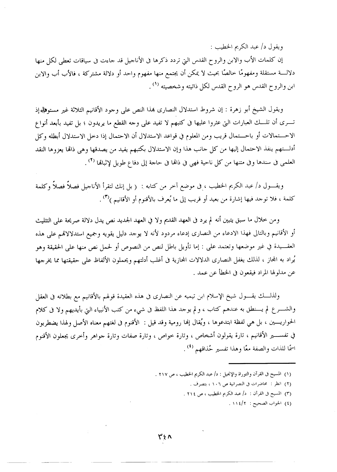 ويقول د/ عبد الكريم الخطيب، في موضع آخر من كتابه: (بل إنك لتقرا الأناجيل فصلًا فصلًا وكلمة كلمة، فلا توجد فيها إشارة من بعيد أو قريب إلى ما يُعرف بالأقنوم أو الأقانيم) (¬3).
