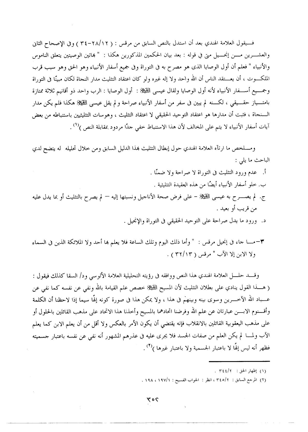وقد حلل العلامة الهندي هذا النص ووافقه في رؤيته التحليلية العلامة الألوسي ود/ السقا كذلك فيقول: (هذا القول ينادي على بطلان التثليث لأنّ المسيح -عليه السلام- خصص علم القيامة بالله ونفى عن نفسه كما نفي عن عباد الله الآخرين وسوى بينه وبينهم في هذا، ولا يمكن هذا في صورة كونه إلهًا سيما إذا لاحظنا أن الكلمة وأقنوم الابن عبارتان عن علم الله وفرضنا اتحادهما بالمسيح وأخذنا هذا الاتحاد على مذهب القائلين بالحلول أو على مذهب اليعقوبية القائلين بالانقلاب فإنه يقتضى أن يكون الأمر بالعكس ولا أقل من أن يعلم الابن كما يعلم الآب ولما لم يكن العلم من صفات الجسد فلا يجرى عليه في عذرهم المشهور أنه نفى عن نفسه باعتبار جسميته فظهر أنه ليس إلهًا لا باعتبار الجسمية ولا باعتبار غيرها) (¬2).