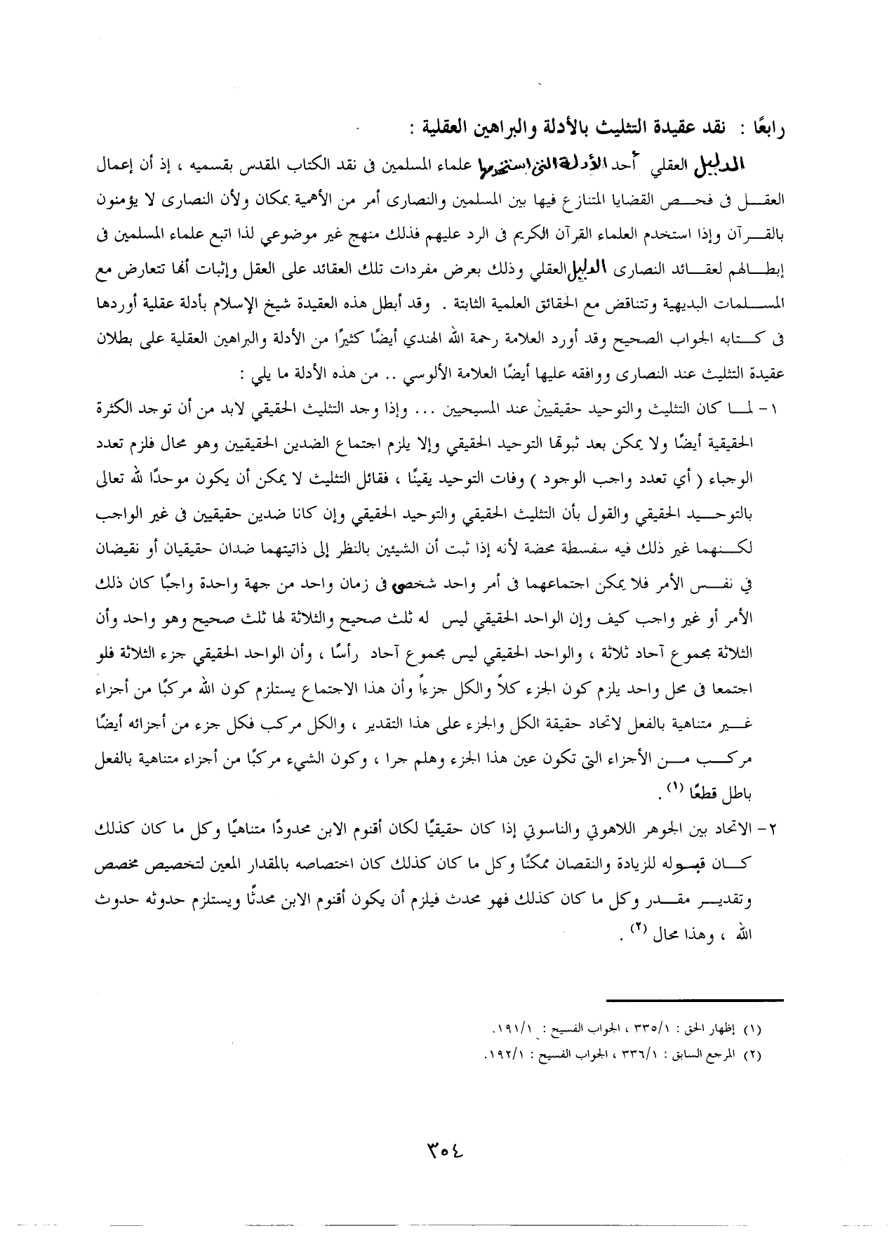 1 - لما كان التثليث والتوحيد حقيقيين عند المسيحيين ... وإذا وجد التثليث الحقيقى لا بد من أن توجد الكثرة الحقيقية أيضًا ولا يمكن بعد ثبوتها التوحيد الحقيقى وإلا يلزم اجتماع الضدين الحقيقيين وهو محال فلزم تعدد الوجباء (أي تعدد واجب الوجود) وفات التوحيد يقينًا، فقائل التثليث لا يمكن أن يكون موحدًا لله تعالى بالتوحيد الحقيقى والقول بأن التثليث الحقيقى والتوحيد الحقيقى وإن كانا ضدين حقيقيين في غير الواجب لكنهما غير ذلك فيه سفسطة محضة لأنه إذا ثبت أن الشيئين بالنظر إلى ذاتيتهما ضدان حقيقيان أو نقيضان في نفس الأمر فلا يمكن اجتماعهما في أمر واحد شخصى في زمان واحد من جهة واحدة واجبًا كان ذلك الأمر أو غير واجب كيف وإن الواحد الحقيقى ليس له ثلث صحيح والثلاثة لها ثلث صحيح وهو واحد وأن الثلاثة مجموع آحاد ثلاثة، والواحد الحقيقي ليس مجموع آحاد رأسًا، وأن الواحد الحقيقي جزء الثلاثة فلو اجتمعا في محلّ واحد يلزم كون الجزء كلًا والكل جزءًا وأن هذا الاجتماع يستلزم كون الله مركبًا من أجزاء غير متناهية بالفعل لاتحاد حقيقة الكل والجزء على هذا التقدير، والكل مركب فكل جزء من أجزائه أيضًا مركب من الأجزاء التي تكون عين هذا الجزء وهلم جرا، وكون الشيء مركبًا من أجزاء متناهية بالفعل باطل قطعًا (¬1).