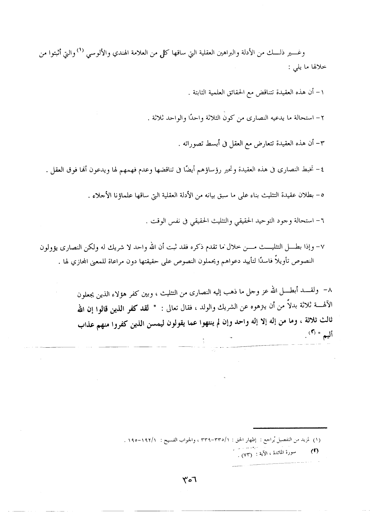 8 - ولقد أبطل الله عَزَّ وَجَلَّ ما ذهب إليه النصارى من التثليث، وبين كفر هؤلاء الذين يجعلون الآلهة ثلاثة بدلًا من أن ينزهوه عن الشريك والولد، فقال تعالى: {لَقَدْ كَفَرَ الَّذِينَ قَالُوا إِنَّ اللَّهَ ثَالِثُ ثَلَاثَةٍ وَمَا مِنْ إِلَهٍ إِلَّا إِلَهٌ وَاحِدٌ وَإِنْ لَمْ يَنْتَهُوا عَمَّا يَقُولُونَ لَيَمَسَّنَّ الَّذِينَ كَفَرُوا مِنْهُمْ عَذَابٌ أَلِيمٌ} (¬2)