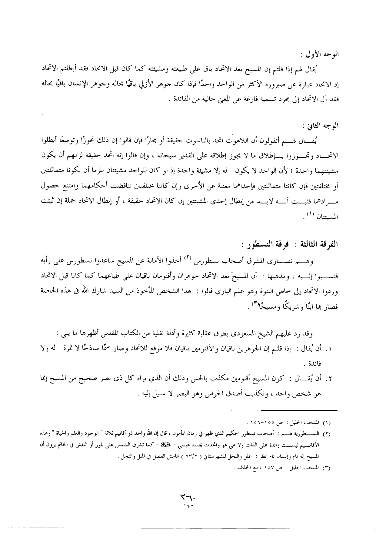 (¬2) النسطررية هم: أصحاب نسطور الحكيم الذي ظهر في زمان المأمون، قال إن الله واحد ذو أقانيم ثلاثة "الوجود والعلم والحياة" وهذه الأقانيم ليست زائدة على الذات ولا هي هو واتحدت بجسد عيسي -عليه السلام- كما تشرق الشمس على بلور أو النقش في الخاتم يرون أن المسيح إله تام وإنسان تام انظر: الملل والنحل للشهرستاني (2/ 53) بهامش الفصل في الملل والنحل.