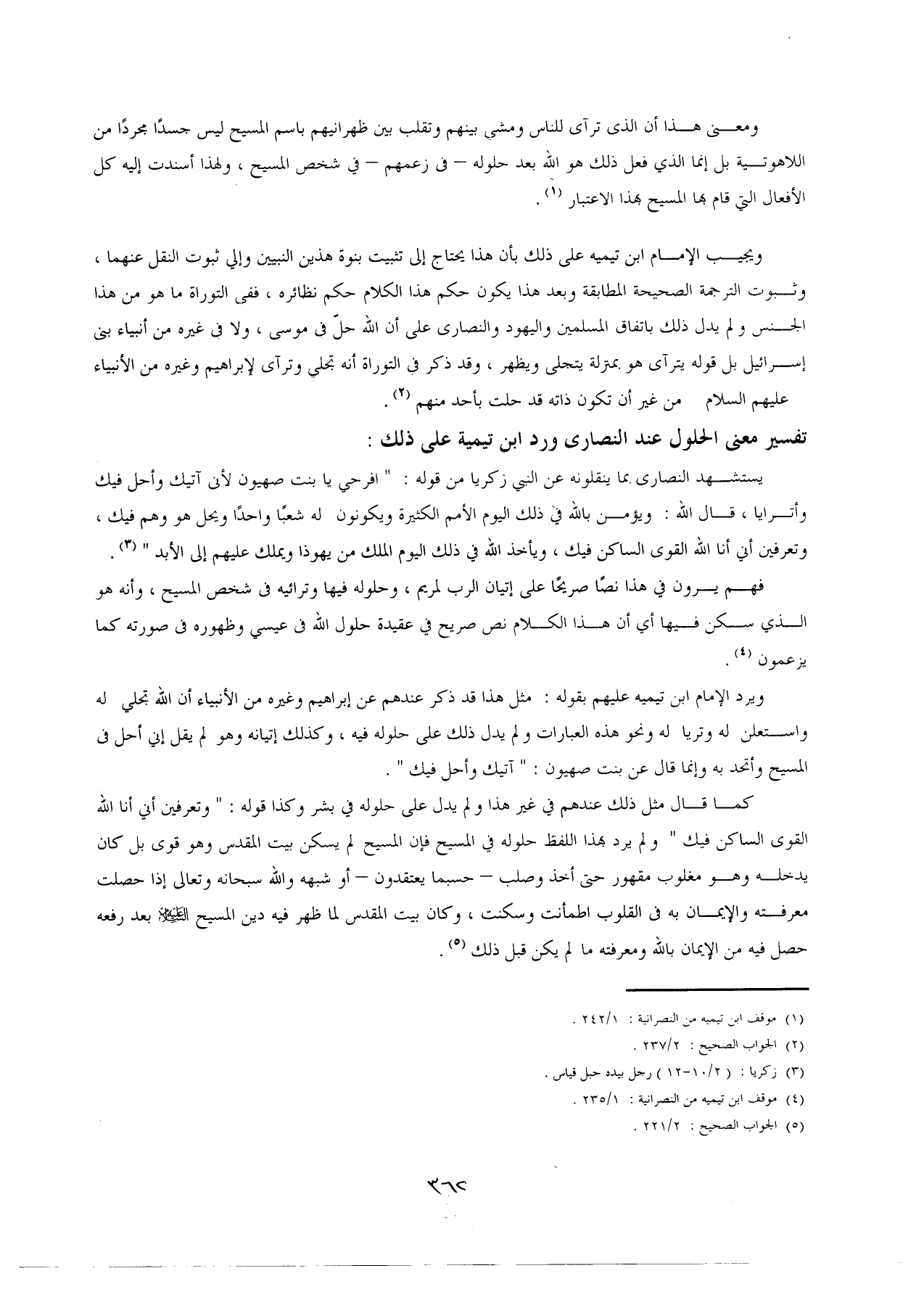 ويجيب الإمام ابن تيميه على ذلك بأن هذا يحتاج إلى تثبيت بنوة هذين النبيين وإلى ثبوت النقل عنهما، وثبوت الترجمة الصحيحة المطابقة وبعد هذا يكون حكم هذا الكلام حكم نظائره، ففي، التوراة ما هو من هذا الجنس ولم يدل ذلك باتفاق المسلمين واليهود والنصارى على أن الله حلّ في موسى، ولا في غيره من أنبياء بني إسرائيل بل قوله يترآى هو بمنزلة يتجلى ويظهر، وقد ذكر في التوراة أنه تجلي وترآى لإبراهيم وغيره من الأنبياء عليهم السلام من غير أن تكون ذاته قد حلت بأحد منهم (¬2).