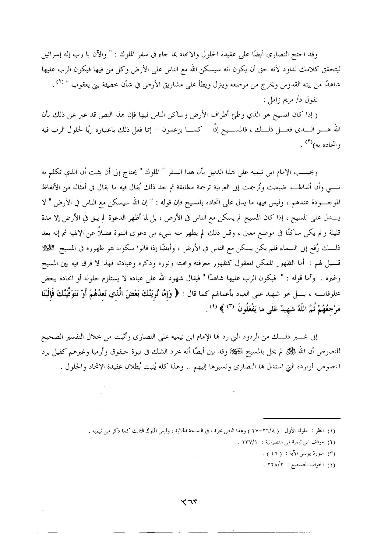 ويجيب الإمام ابن تيميه على هذا الدليل بأن هذا السفر "الملوك" يحتاج إلى أن يثبت أن الذي تكلم به نبي وأن ألفاظه ضبطت وتُرجمت إلى العربية ترجمة مطابقة ثم بعد ذلك يُقال فيه ما يقال في أمثاله من الألفاظ الموجودة عندهم، وليس فيها ما يدل على اتحاده بالمسيح فإن قوله: "إن الله سيسكن مع الناس في الأرض" لا يدلّ على المسيح، إذا كان المسيح لم يسكن مع الناس في الأرض، بل لما أظهر الدعوة لم يبق في الأرض إلا مدة قليلة ولم يكن ساكنًا في موضع معين، وقبل ذلك لم يظهر منه شيء من دعوى البنوة فضلًا عن الإلهية ثم إنه بعد ذلك رُفع إلى السماء فلم يكن يسكن مع الناس في الأرض، وأيضًا إذا قالوا سكونه هو ظهوره في المسيح -عليه السلام- قيل لهم: أما الظهور الممكن المعقول كظهور معرفته ومحبته ونوره وذكره وعبادته فهذا لا فرق فيه بين المسيح وغيره. وأما قوله: "فيكون الرب عليها شاهدًا" فيقال شهود الله على عباده لا يستلزم حلوله أو اتحاده ببعض مخلوقاته، بل هو شهيد على العباد بأعمالهم كما قال: {وَإِمَّا نُرِيَنَّكَ بَعْضَ الَّذِي نَعِدُهُمْ أَوْ نَتَوَفَّيَنَّكَ فَإِلَيْنَا مَرْجِعُهُمْ ثُمَّ اللَّهُ شَهِيدٌ عَلَى مَا يَفْعَلُونَ (¬3)} (¬4).
