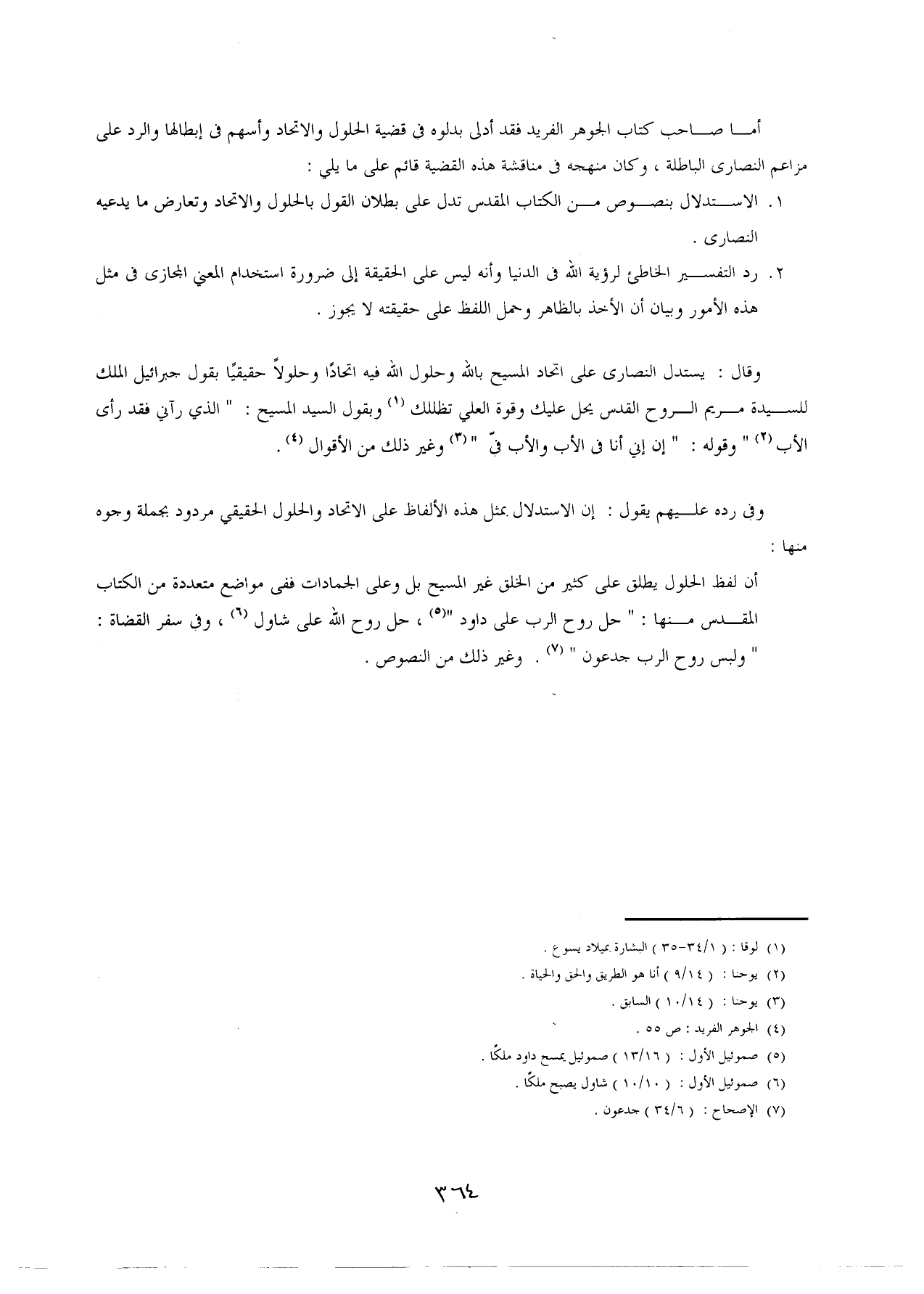 وقال: يستدل النصارى على اتحاد المسيح بالله وحلول الله فيه اتحادًا وحلولًا حقيقيًا بقول جبرائيل الملك للسيدة مريم الروح القدس يحل عليك وقوة العلي تظللك (¬1) وبقول السيد المسيح: "الذي رآني فقد رأى الأب (¬2) " وقوله: "إن إني أنا في الأب والأب فىّ" (¬3) وغير ذلك من الأقوال (¬4).