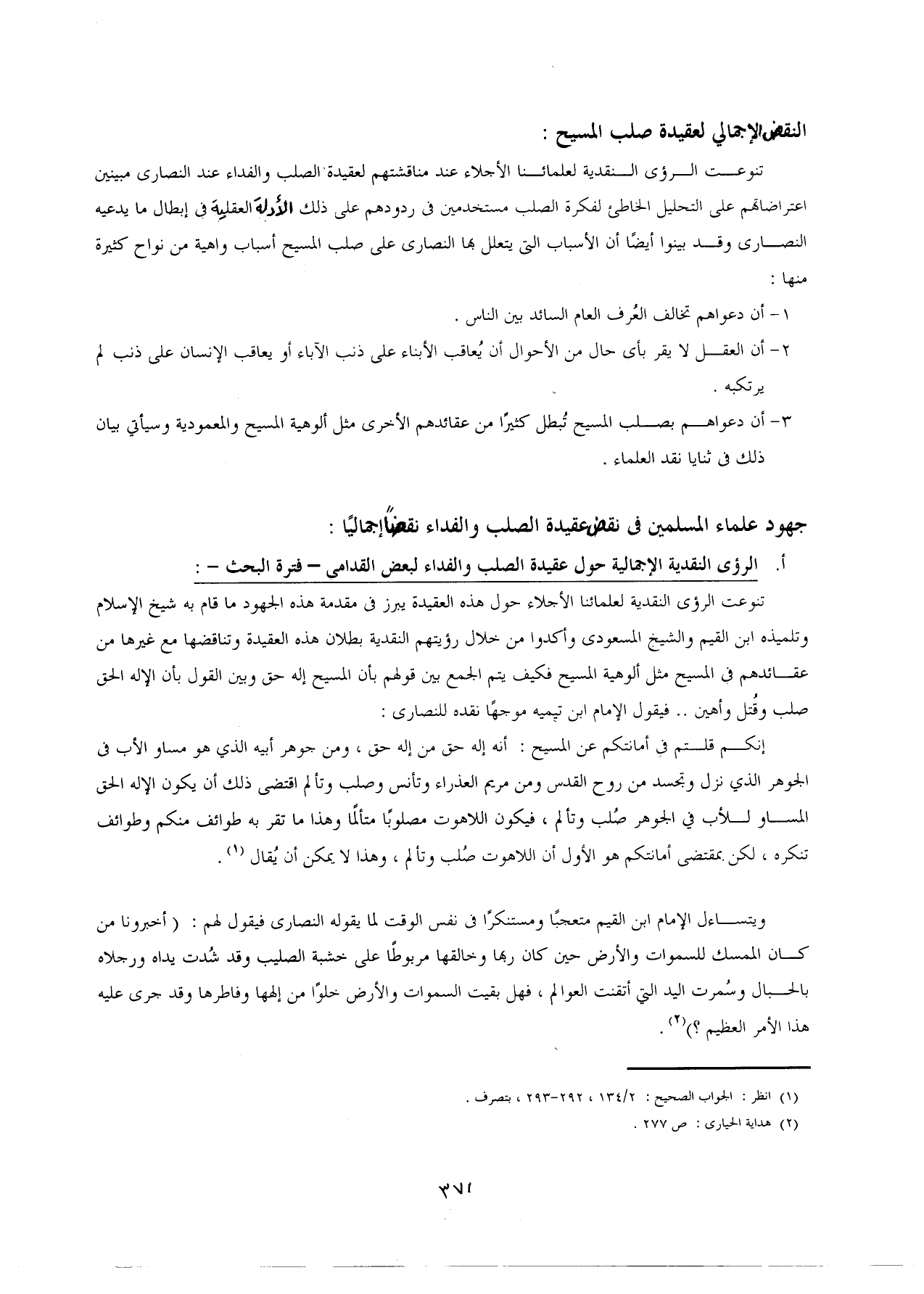 جهود علماء المسلمين في نقض عقيدة الصلب والفداء نقضًا إجماليًا: