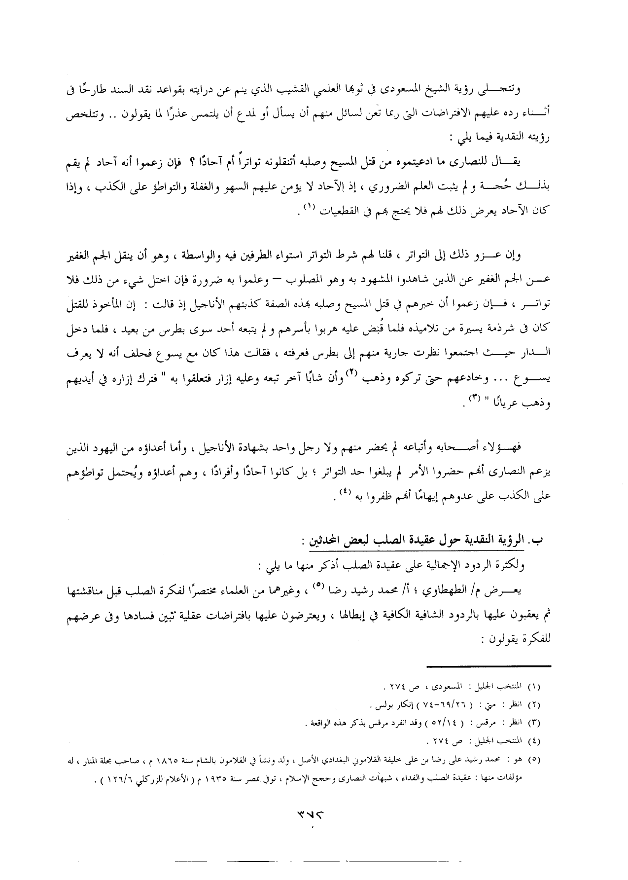 (¬5) هو: محمَّد رشيد علي رضا بن علي خليفة القلامونى البغدادي الأصل، ولد ونشأ في القلامون بالشام سنة 1865 م، صاحب مجلة المنار، له مؤلفات منها: عقيدة الصلب والفداء، شبهات النصارى وحجج الإِسلام، توفي بمصر سنة 1935م (الأعلام للزركلي 6/ 126).