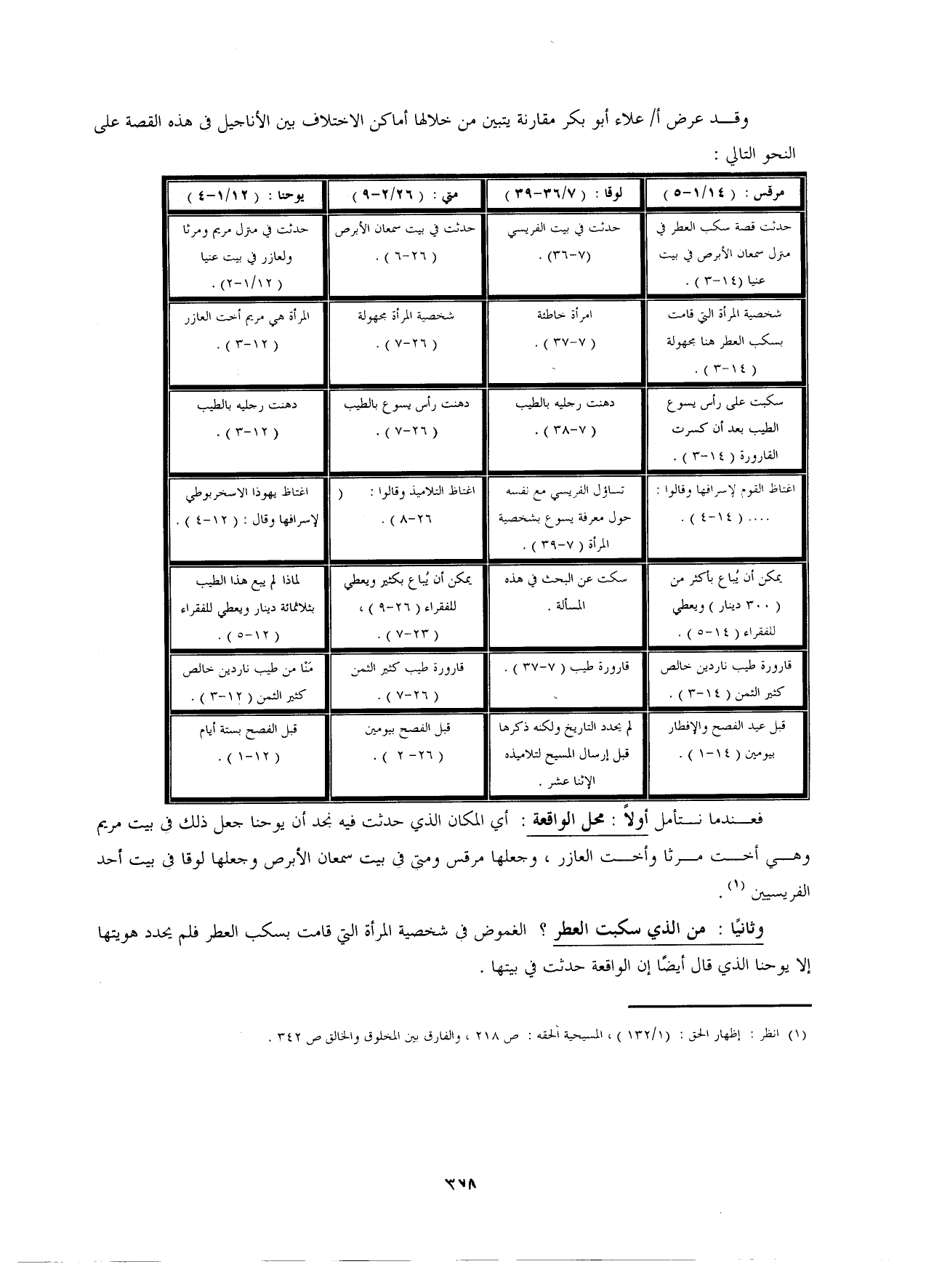 فعندما نتأمل أولًا: محلّ الواقعة: أي المكان الذي حدثت فيه نجد أن يوحنا جعل ذلك في بيت مريم وهي أخت مرثا وأخت العازر، وجعلها مرقس ومتى في بيت سمعان الأبرص وجعلها لوقا في بيت أحد الفريسيين (¬1).