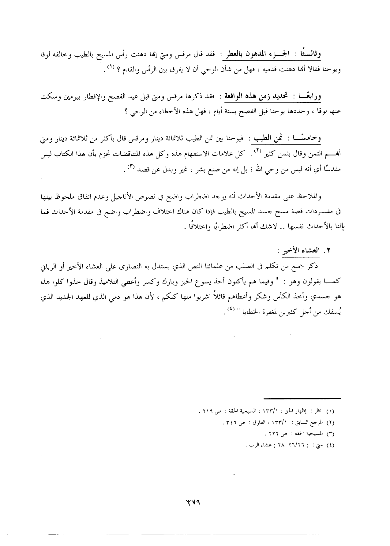 وثالثًا: الجزء المدهون بالعطر: فقد قال مرقس ومتى إنها دهنت رأس المسيح بالطيب وخالفه لوقا ويوحنا فقالا أنها دهنت قدميه، فهل من شأن الوحي أن لا يفرق بين الرأس والقدم؟ (¬1).