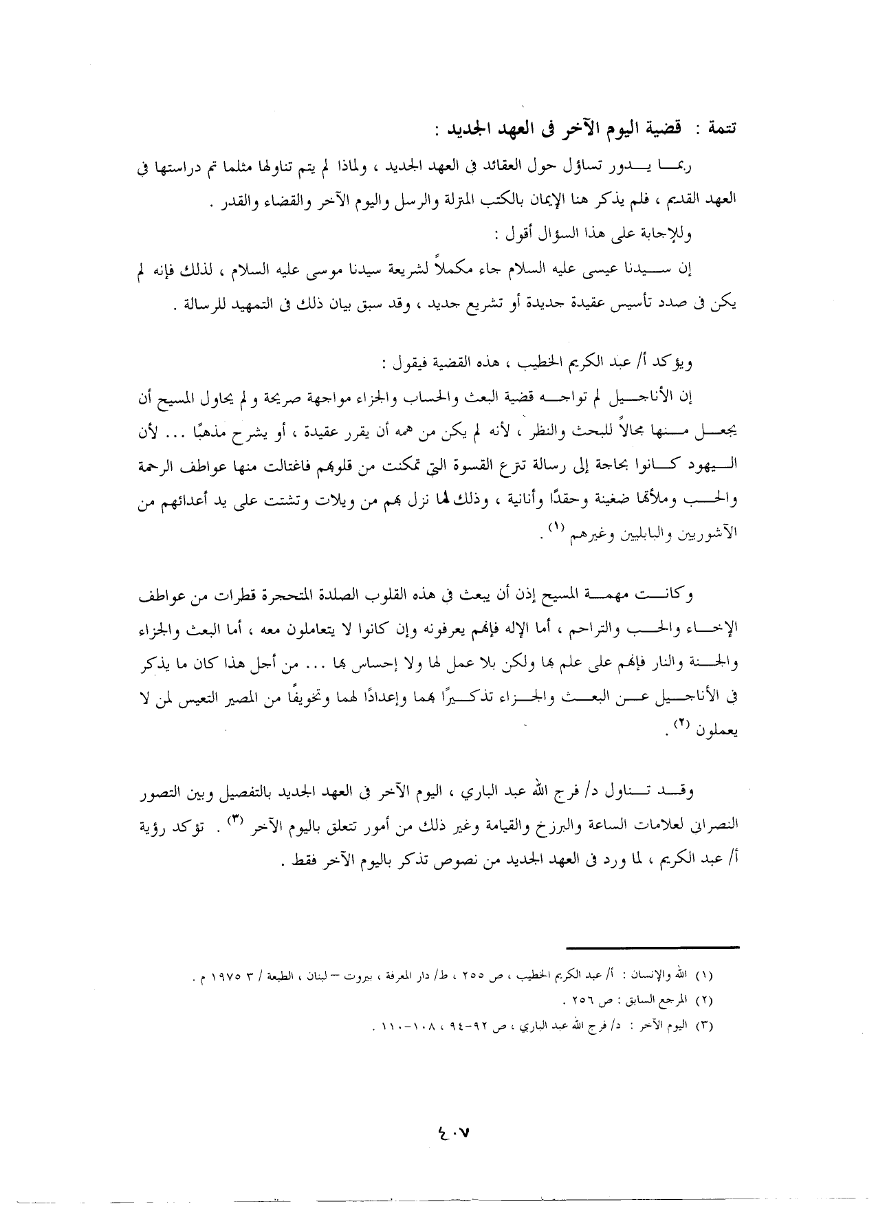 وقد تناول د/ فرج الله عبد الباري، اليوم الآخر في العهد الجديد بالتفصيل وبين التصور النصرانى لعلامات الساعة والبرزخ والقيامة وغير ذلك من أمور تتعلق باليوم الآخر (¬3). تؤكد رؤية أ/ عبد الكريم، لما ورد في العهد الجديد من نصوص تذكر باليوم الآخر فقط.