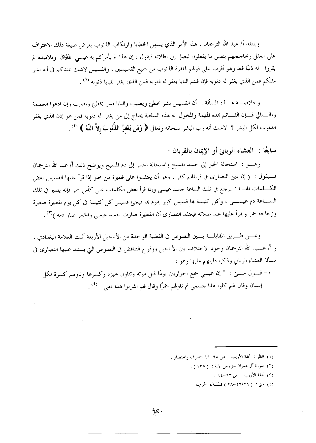 وخلاصة هذه المسألة: أن القسيس بشر يخطئ ويصيب والبابا بشر يخطئ ويصيب وإن ادعوا العصمة وبالتالي فإن القائم بهذه المهمة والمخول له هذه السلطة يحتاج إلى من يغفر له ذنوبه فمن هو إذن الذي يغفر الذنوب لكل البشر؟ لا شك أنه رب البشر سبحانه وتعالى {وَمَنْ يَغْفِرُ الذُّنُوبَ إِلَّا اللَّهُ} (¬2).