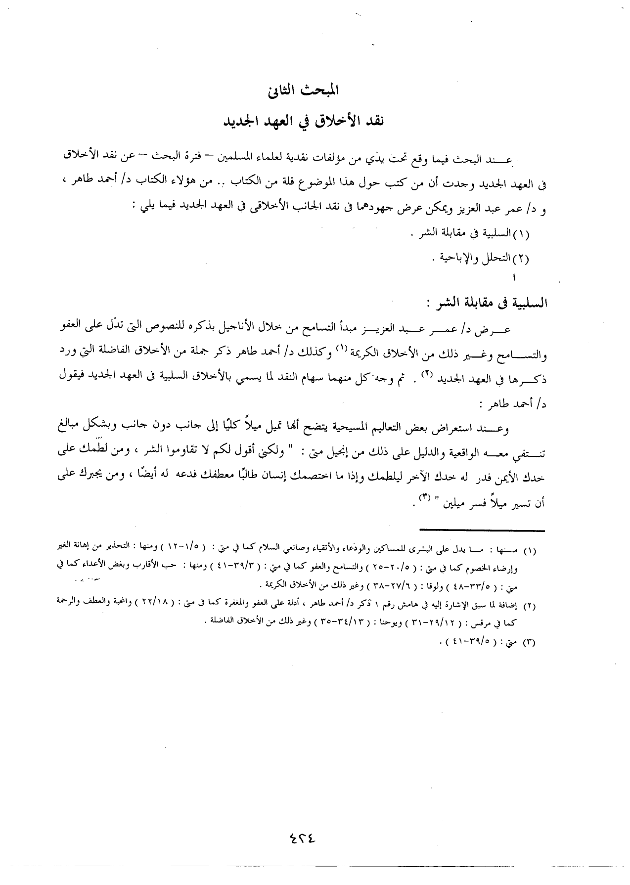 (¬2) إضافة لما سبق الإشارة إليه في هامش رقم 1 ذكر د/ أحمد طاهر، أدلة على العفو والمغفرة كما في متى: (18/ 22) والمحبة والعطف والرحمة كما في مرقس: (12/ 29 - 31) ويوحنا: (13/ 34 - 35) وغير ذلك من الأخلاق الفاضلة.