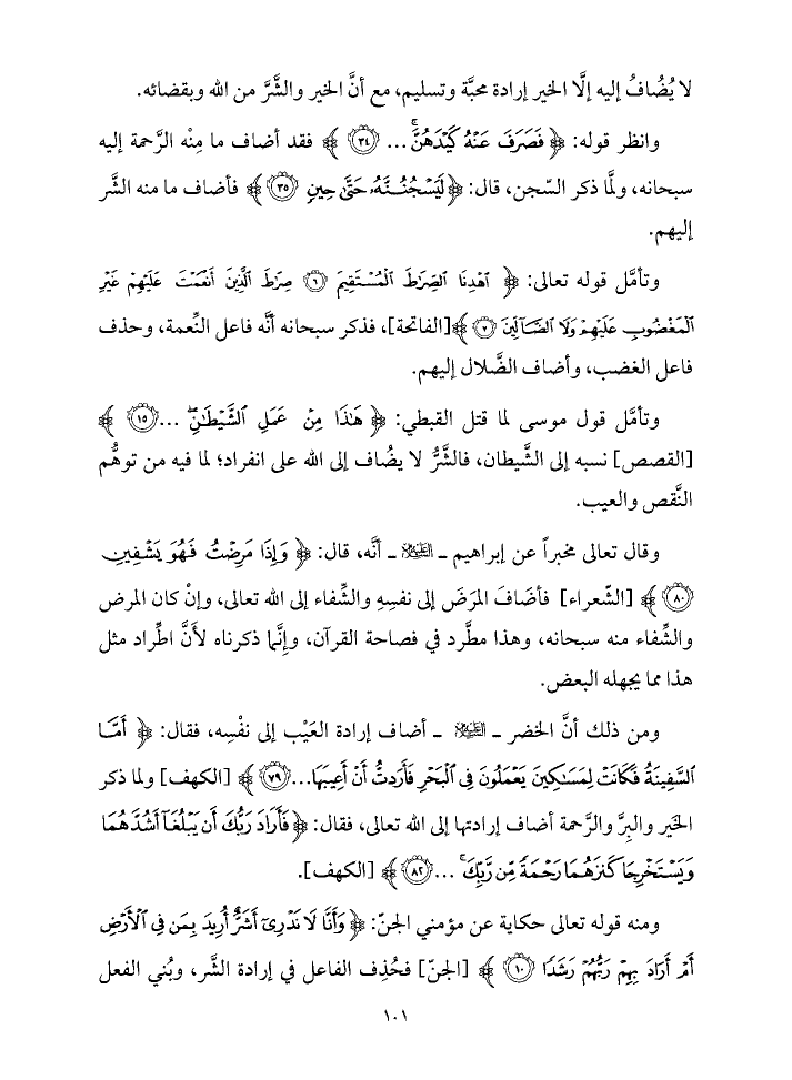 ومن ذلك أنَّ الخضر ـ - عليه السلام - ـ أضاف إرادة العَيْب إلى نفْسِه، فقال: {أَمَّا السَّفِينَةُ فَكَانَتْ لِمَسَاكِينَ يَعْمَلُونَ فِي الْبَحْرِ ... فَأَرَدْتُ أَنْ أَعِيبَهَا ... (٧٩)} [الكهف] ولما ذكر الخَير والبِرَّ والرَّحمة أضاف إرادتها إلى الله تعالى، فقال: {فَأَرَادَ رَبُّكَ أَنْ يَبْلُغَا أَشُدَّهُمَا وَيَسْتَخْرِجَا كَنْزَهُمَا رَحْمَةً مِنْ رَبِّكَ ... (٨٢)} [الكهف].