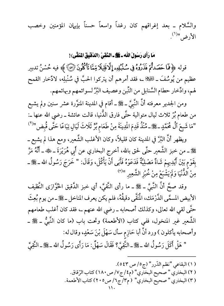 وقد صحَّ أنَّ النَّبيَّ ـ - صلى الله عليه وسلم - ـ ما رأى النَّقيَّ، أي خبز الدَّقيق الحُوَّارَى النَّظيف الأبيض المسمَّى الدَّرْمَك، المُنَقَّى دقيقُهُ، فلم يكن يعرف المناخل ـ - صلى الله عليه وسلم - ـ من يوم بُعِثَ حتَّى لقي الله تعالى، وكذلك أصحابه ـ رضي الله عنهم ـ، فقد كان أغلب طعامهم الشَّعير غير المنخول، ففي كتاب (الأطعمة) وتحت باب (ما كان النَّبيُّ ـ - صلى الله عليه وسلم - ـ وأصحابه يأكلون) ورد أنَّ أبا حَازِمٍ سأل سَهْلَ بْنَ سَعْدٍ، وقال له: