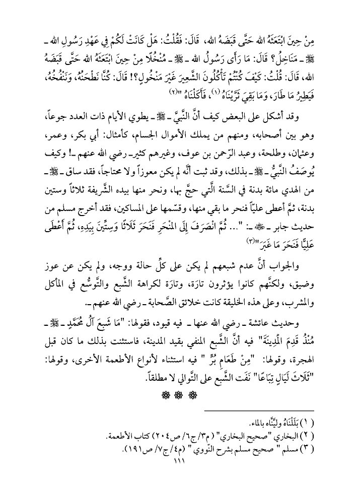 والجواب أنَّ عدم شبعهم لم يكن على كلِّ حالة ووجه، ولم يكن عن عوز وضيق، ولكنَّهم كانوا يؤثرون تارَة، وتارَة لكراهة الشَّبع والتَّوسُّع في المأكل والمشرب، وعلى هذه الخليقة كانت خلائق الصَّحابة ـ رضي الله عنهم ـ.