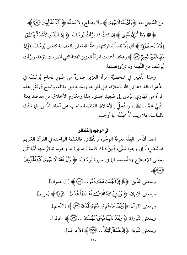 اعلم أنَّ من الفِقْه معْرِفَةَ الوجُوه والنَّظائر، فالكلمة الواحدة في القرآن الكريم قد تَنْصَرِفُ إلى وجوه شتَّى، فَمِنْ ذلك كلمة (الهدى) لها وجوه، نذكرُ منها أنَّها تأتي بمعنى الإصلاح والتَّسديد كما في سورة يُوسُفَ: {وَأَنَّ اللَّهَ لَا يَهْدِي كَيْدَ الْخَائِنِينَ (٥٢)}.