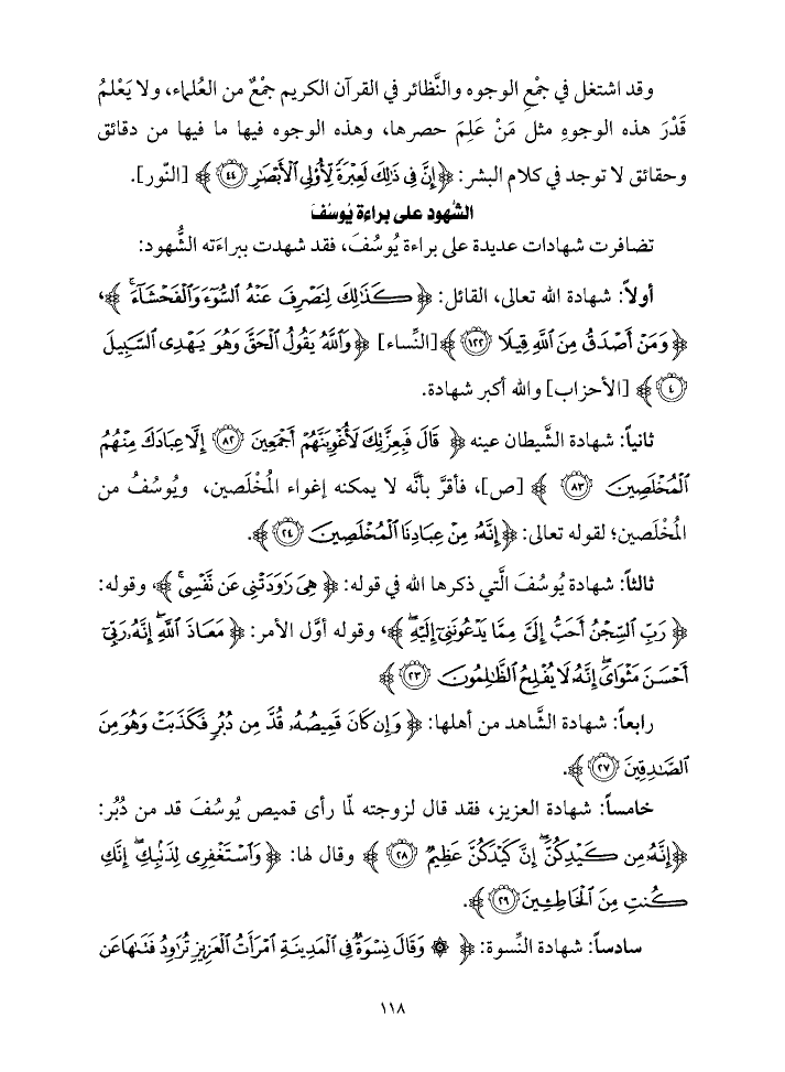 ثالثاً: شهادة يُوسُفَ الَّتي ذكرها الله في قوله: {هِيَ رَاوَدَتْنِي عَنْ نَفْسِي}، وقوله: {رَبِّ السِّجْنُ أَحَبُّ إِلَيَّ مِمَّا يَدْعُونَنِي إِلَيْهِ}، وقوله أوَّل الأمر: {مَعَاذَ اللَّهِ إِنَّهُ رَبِّي أَحْسَنَ مَثْوَايَ إِنَّهُ لَا يُفْلِحُ الظَّالِمُونَ (٢٣)} رابعاً: شهادة الشَّاهد من أهلها: {وَإِنْ كَانَ قَمِيصُهُ قُدَّ مِنْ دُبُرٍ فَكَذَبَتْ وَهُوَ مِنَ الصَّادِقِينَ (٢٧)}.