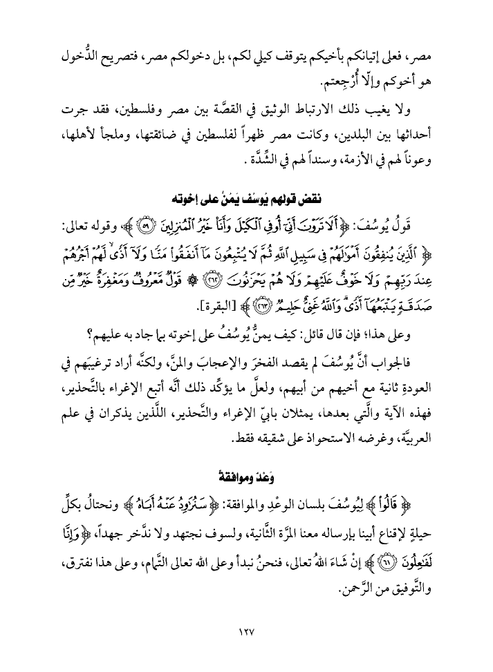 فالجواب أنَّ يُوسُفَ لم يقصد الفخرَ والإعجابَ والمنَّ، ولكنَّه أراد ترغيبَهم في العودةِ ثانية مع أخيهم من أبيهم، ولعلَّ ما يؤكِّد ذلك أنَّه أتبع الإغراء بالتَّحذير، فهذه الآية والَّتي بعدها، يمثلان بابيّ الإغراء والتَّحذير، اللَّذين يذكران في علم العربيَّة، وغرضه الاستحواذ على شقيقه فقط.