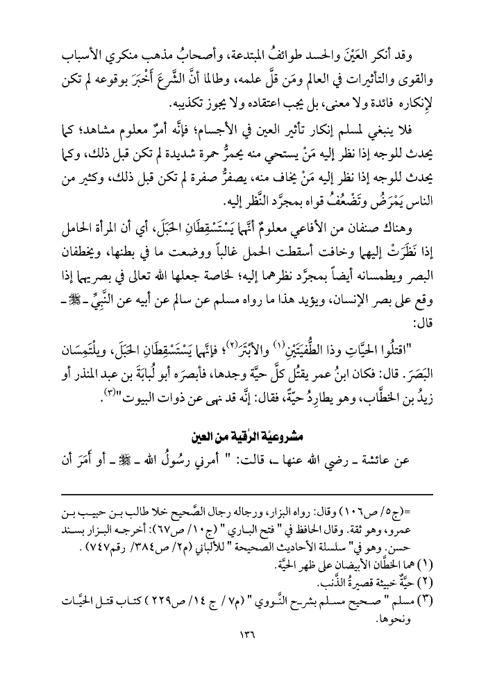 وقد أنكر العَيْنَ والحسد طوائفُ المبتدعة، وأصحابُ مذهب منكري الأسباب والقوى والتأثيرات في العالم ومَن قلَّ علمه، وطالما أنَّ الشَّرعَ أَخْبَرَ بوقوعه لم تكن لإِنكاره فائدة ولا معنى، بل يجب اعتقاده ولا يجوز تكذيبه.