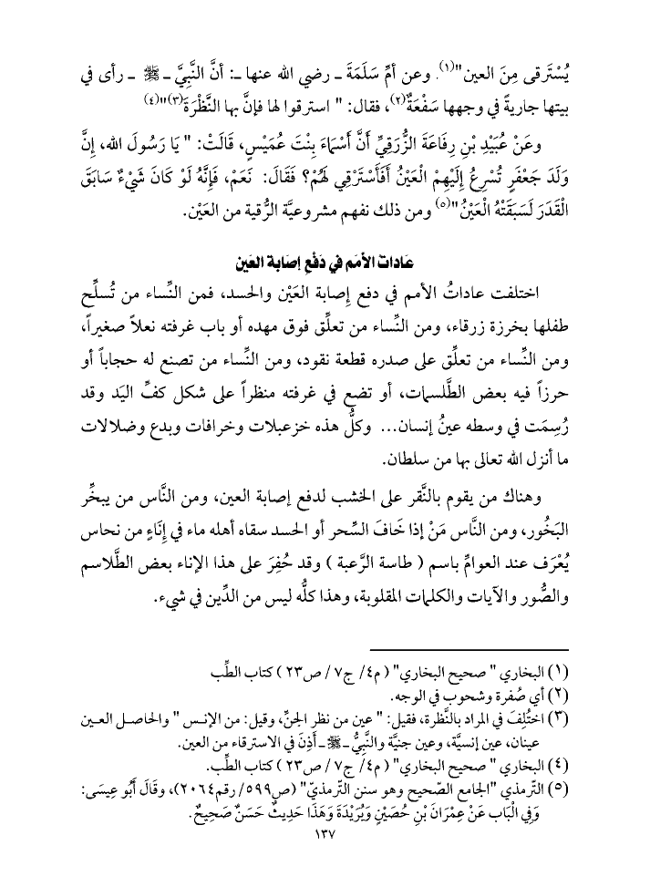 اختلفت عاداتُ الأمم في دفع إِصابة العَيْن والحسد، فمن النِّساء من تُسلِّح طفلها بخرزة زرقاء، ومن النِّساء من تعلِّق فوق مهده أو باب غرفته نعلاً صغيراً، ومن النِّساء من تعلِّق على صدره قطعة نقود، ومن النِّساء من تصنع له حجاباً أو حرزاً فيه بعض الطَّلسمات، أو تضع في غرفته منظراً على شكل كفِّ اليَد وقد رُسِمَت في وسطه عينُ إنسان ... وكلُّ هذه خزعبلات وخرافات وبدع وضلالات ما أنزل الله تعالى بها من سلطان.