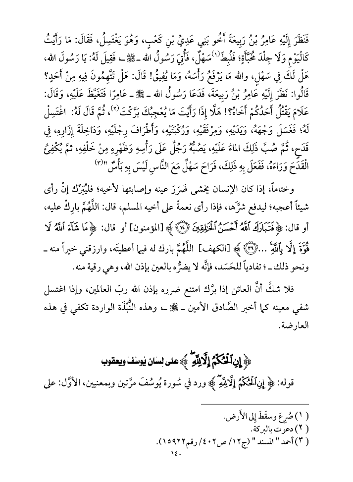 فلا شكَّ أنَّ العائن إذا برَّك امتنع ضرره بإذن الله ربّ العالمين، وإذا اغتسل شفي معينه كما أخبر الصَّادق الأمين ـ - صلى الله عليه وسلم - ـ، وهذه النُّبْذَة الواردة تكفي في هذه العارضة.