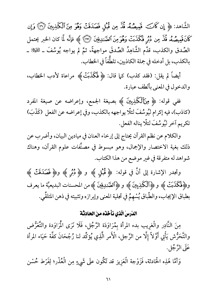 الشَّاهد: {إِنْ كَانَ قَمِيصُهُ قُدَّ مِنْ قُبُلٍ فَصَدَقَتْ وَهُوَ مِنَ الْكَاذِبِينَ (٢٦) وَإِنْ كَانَ قَمِيصُهُ قُدَّ مِنْ دُبُرٍ فَكَذَبَتْ وَهُوَ مِنَ الصَّادِقِينَ (٢٧)} فإنَّه لمَّا كان الخبر يحتمل الصِّدق والكذب، قدَّم الشَّاهِدُ الصِّدقَ مواجهةً، ثمَّ لم يواجه يُوسُفَ ـ - عليه السلام - ـ بالكذب، بل أدخله في جملة الكاذبين، تلطُّفاً في الخطاب.