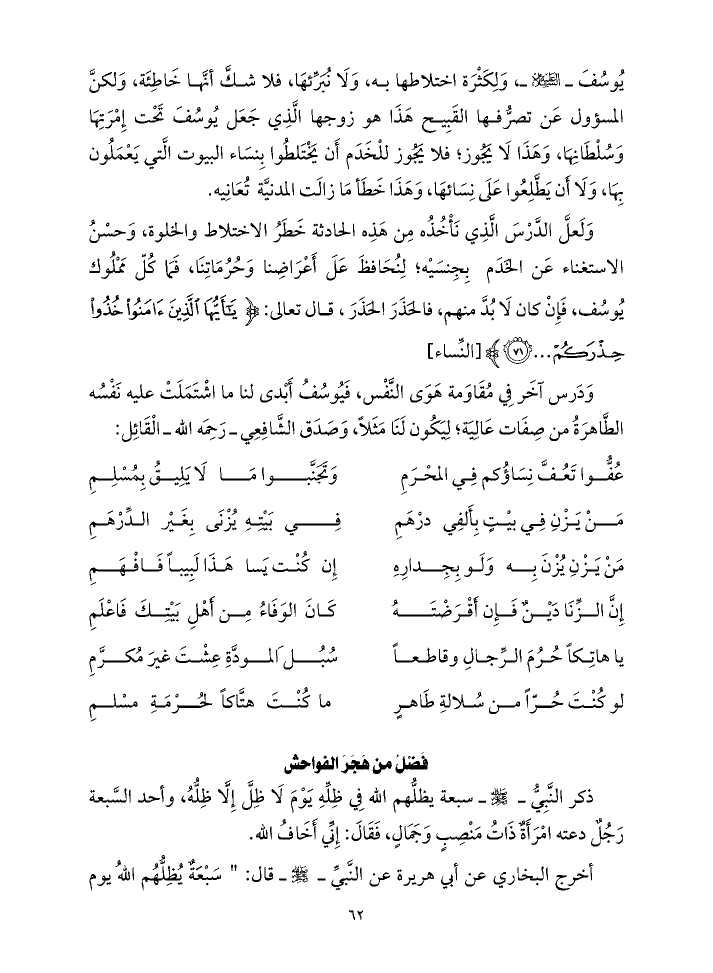 عُفُّوا تَعُفَّ نِسَاؤُكم فِي المحْرَمِ ... وَتَجَنَّبوا مَا لَا يَلِيقُ بِمُسْلِم