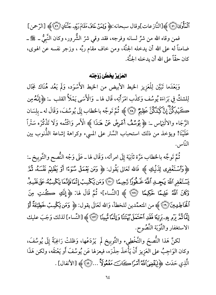 ثُمَّ تَوجَّه بالخطاب مَرَّة ثاَنِيَة إِلَى امرأته، وَقَال لها ـ عَلَى وَجْه النُّصح والتَّوبِيخ ـ: {وَاسْتَغْفِرِي لِذَنْبِكِ} فَالله تَعَالى يَقُول: {وَمَنْ يَعْمَلْ سُوءًا أَوْ يَظْلِمْ نَفْسَهُ ثُمَّ يَسْتَغْفِرِ اللَّهَ يَجِدِ اللَّهَ غَفُورًا رَحِيمًا (١١٠) وَمَنْ يَكْسِبْ إِثْمًا فَإِنَّمَا يَكْسِبُهُ عَلَى نَفْسِهِ وَكَانَ اللَّهُ عَلِيمًا حَكِيمًا (١١١)} [النِّساء]، ثُمَّ قَالَ لها: {إِنَّكِ كُنْتِ مِنَ الْخَاطِئِينَ (٢٩)} من المتعمِّدين للخطأ، وَالله تَعَالَى يقول: {وَمَنْ يَكْسِبْ خَطِيئَةً أَوْ إِثْمًا ثُمَّ يَرْمِ بِهِ بَرِيئًا فَقَدِ احْتَمَلَ بُهْتَانًا وَإِثْمًا مُبِينًا (١١٢)} [النِّساء] لذلك وَجَبَ عليك الاستغفار والتَّوْبَة النَّصُوح.