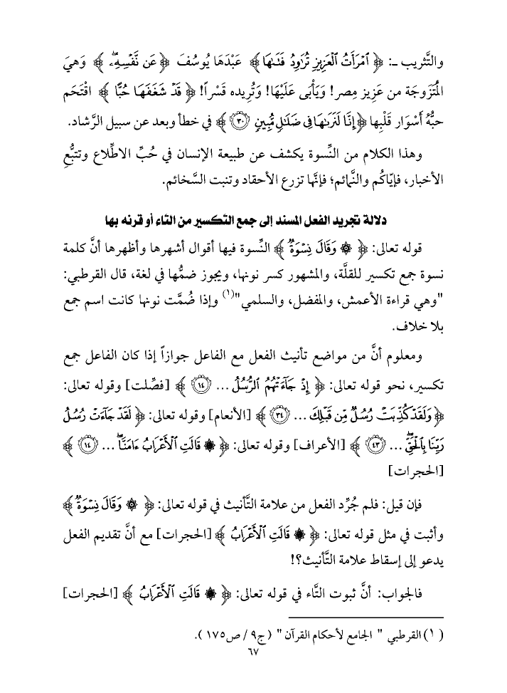 ومعلوم أنَّ من مواضع تأنيث الفعل مع الفاعل جوازاً إذا كان الفاعل جمع تكسير، نحو قوله تعالى: {إِذْ جَاءَتْهُمُ الرُّسُلُ ... (١٤)} [فصِّلت] وقوله تعالى: {وَلَقَدْ كُذِّبَتْ رُسُلٌ مِنْ قَبْلِكَ ... (٣٤)} [الأنعام] وقوله تعالى: {لَقَدْ جَاءَتْ رُسُلُ رَبِّنَا بِالْحَقِّ ... (٤٣)} [الأعراف] وقوله تعالى: {قَالَتِ الْأَعْرَابُ آمَنَّا ... (١٤)} [الحجرات]
