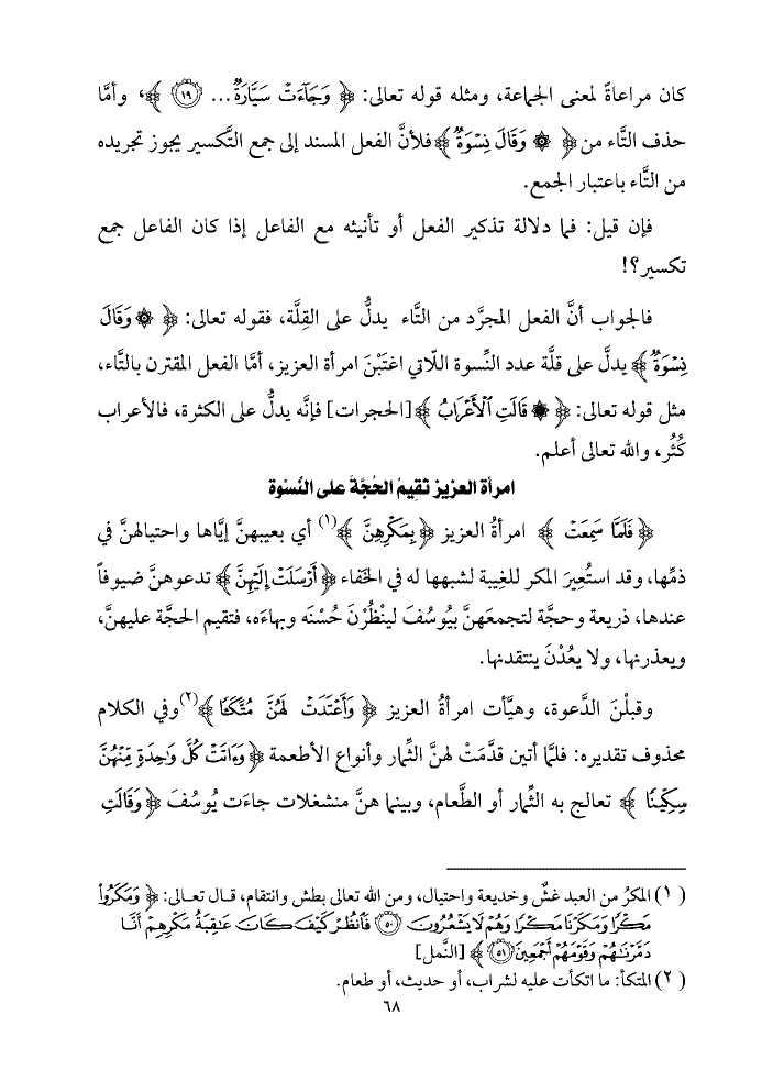 فالجواب أنَّ الفعل المجرَّد من التَّاء يدلُّ على القِلَّة، فقوله تعالى: {وَقَالَ نِسْوَةٌ} يدلَّ على قلَّة عدد النِّسوة اللّاتي اغتَبْنَ امرأة العزيز، أمَّا الفعل المقترن بالتَّاء، مثل قوله تعالى: {قَالَتِ الْأَعْرَابُ} [الحجرات] فإنَّه يدلُّ على الكثرة، فالأعراب كُثُر، والله تعالى أعلم.