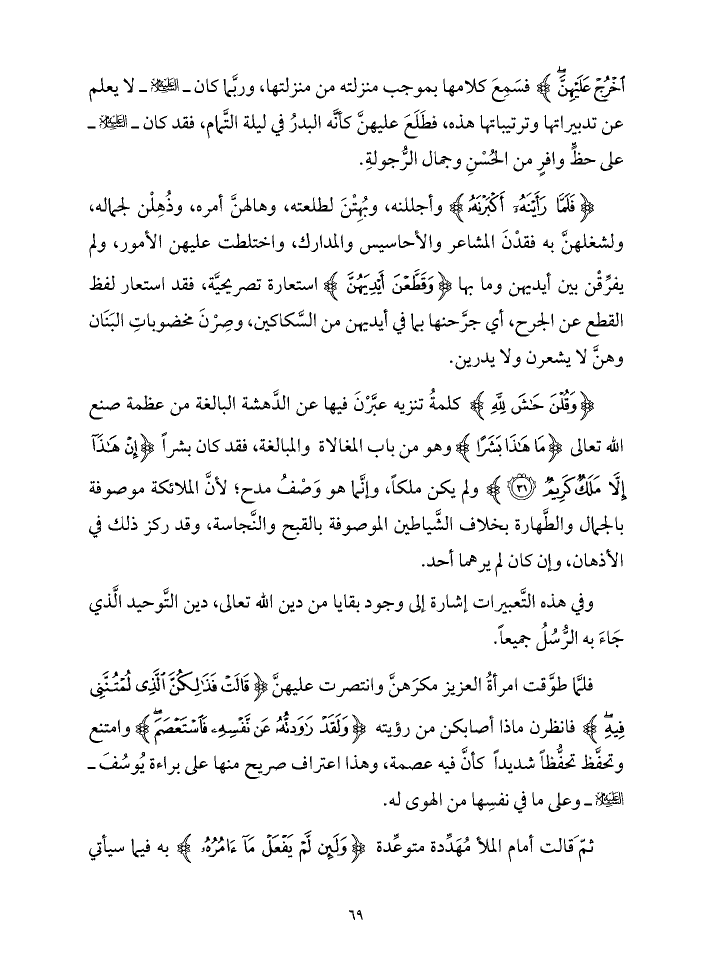 {فَلَمَّا رَأَيْنَهُ أَكْبَرْنَهُ} وأجللنه، وبُهِتْنَ لطلعته، وهالهنَّ أمره، وذُهِلْن لجماله، ولشغلهنَّ به فقدْنَ المشاعر والأحاسيس والمدارك، واختلطت عليهن الأمور، ولم يفرِّقْن بين أيديهن وما بها {وَقَطَّعْنَ أَيْدِيَهُنَّ} استعارة تصريحيَّة، فقد استعار لفظ القطع عن الجرح، أي جرَّحنها بما في أيديهن من السَّكاكين، وصِرْنَ مخضوباتِ البَنَان وهنَّ لا يشعرن ولا يدرين.